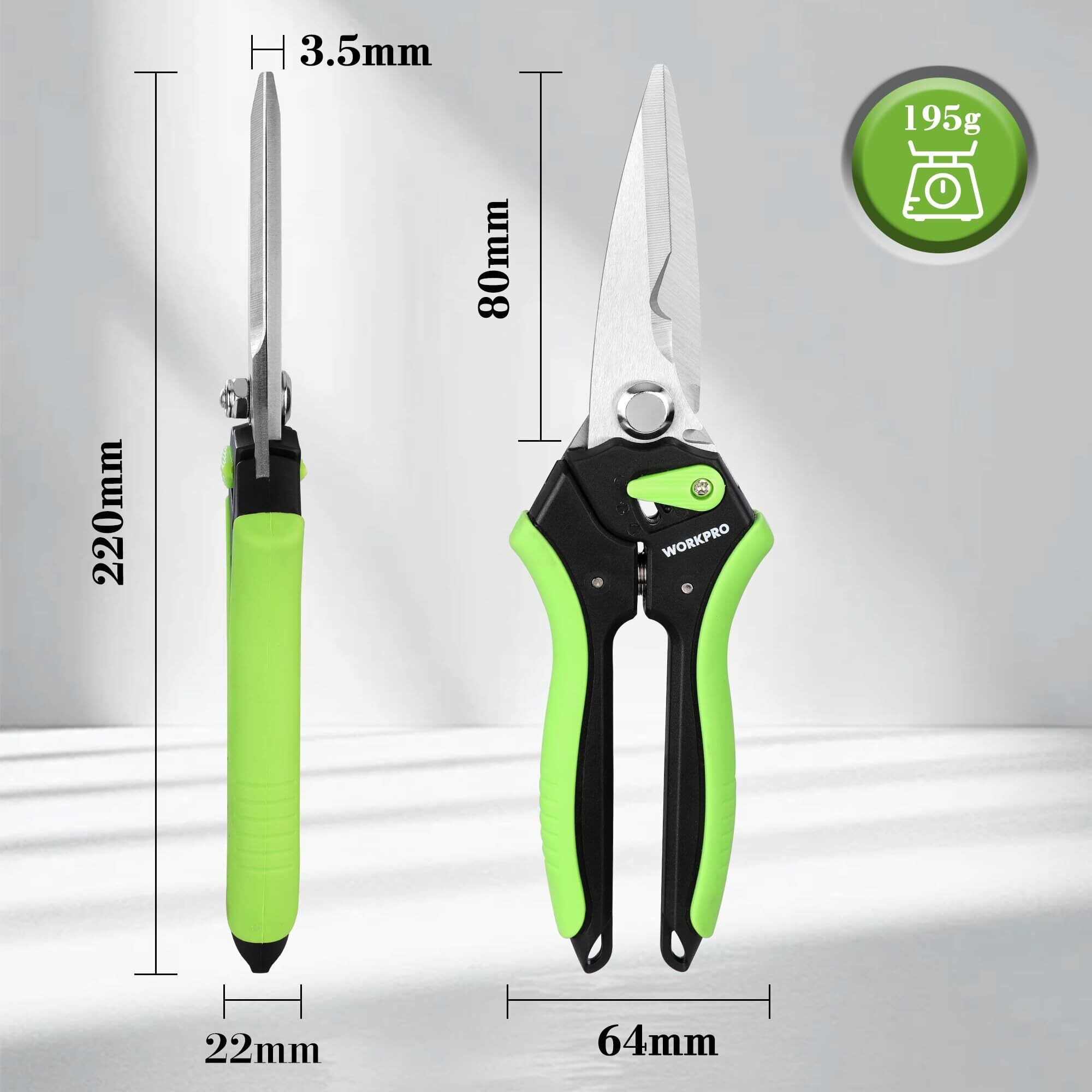 WORKPRO 万能ハサミ 強力はさみ 全長約220mm 【省力バネ構造 開口幅調整可能】 安全ロック付き 多目的切断工具 ステンレス鋼製刃 左右利きロック設計 アルミ板 軟金属線 ダンボール 薄い革や布 粗大ゴミ解体 園芸 大工用 家庭用 作業用
