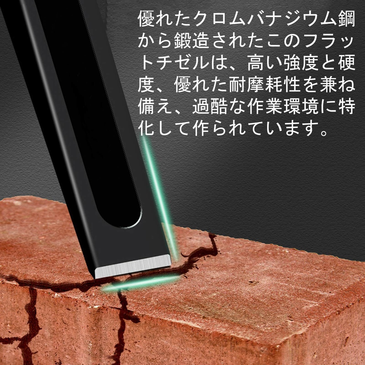 【素材】この鋼鉄石工ノミは優れたクロムバナジウム鋼から鍛造されており、高い強度、硬度、耐摩耗性を兼ね備えています。過酷な作業環境にも対応できる設計です。