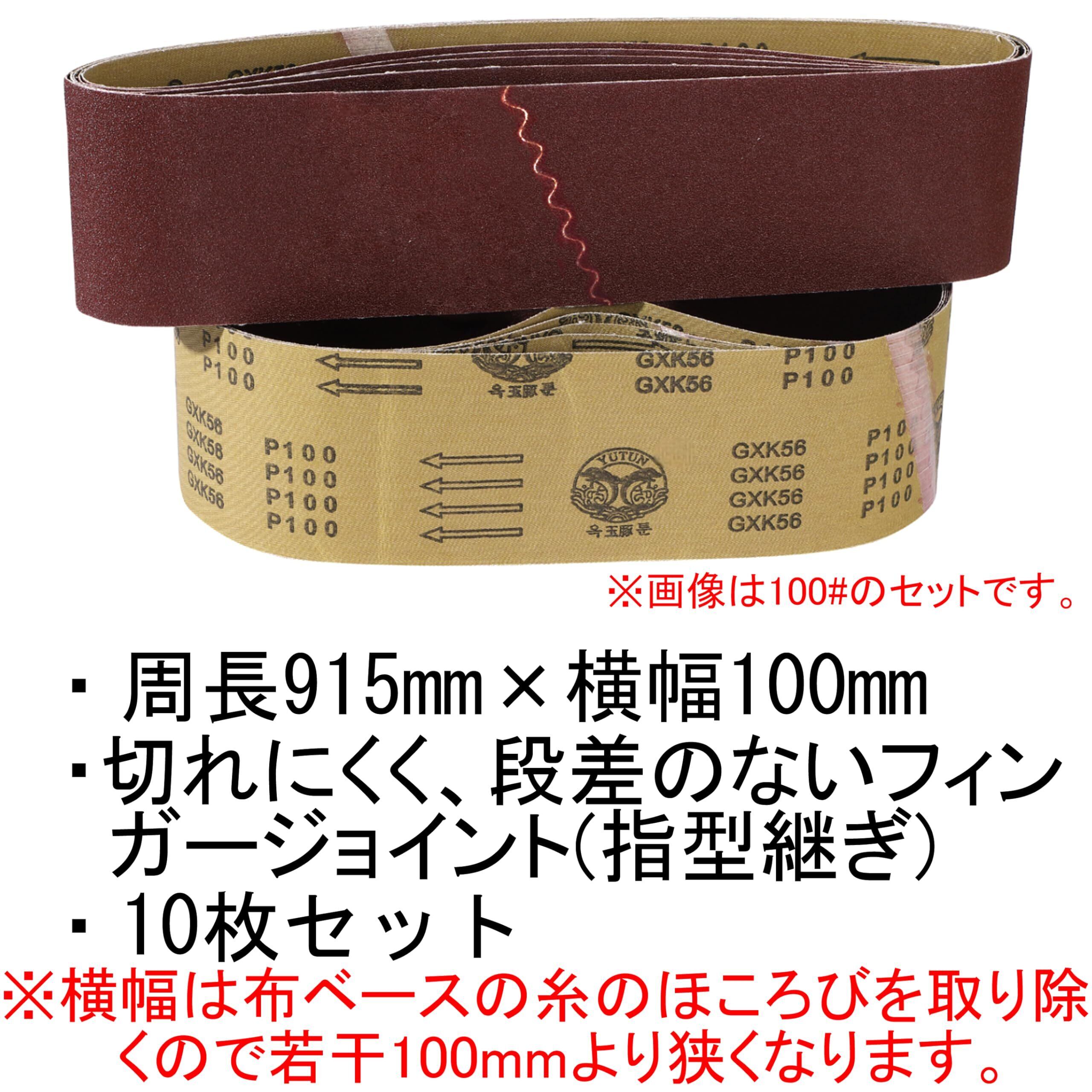 研磨対象物がつなぎ目で踊らない。限りなくつなぎ目が平らになった限定特注のベルトサンダー専用の汎用交換ベルトの10枚入りセットです。布ベースの為、側面の糸のほつれを綺麗に取り除いてのお渡しの為100mmより横幅が少し狭いのはご了承下さい。10枚セットですので遠慮せず使い捨ての感覚でガンガン研磨できます。