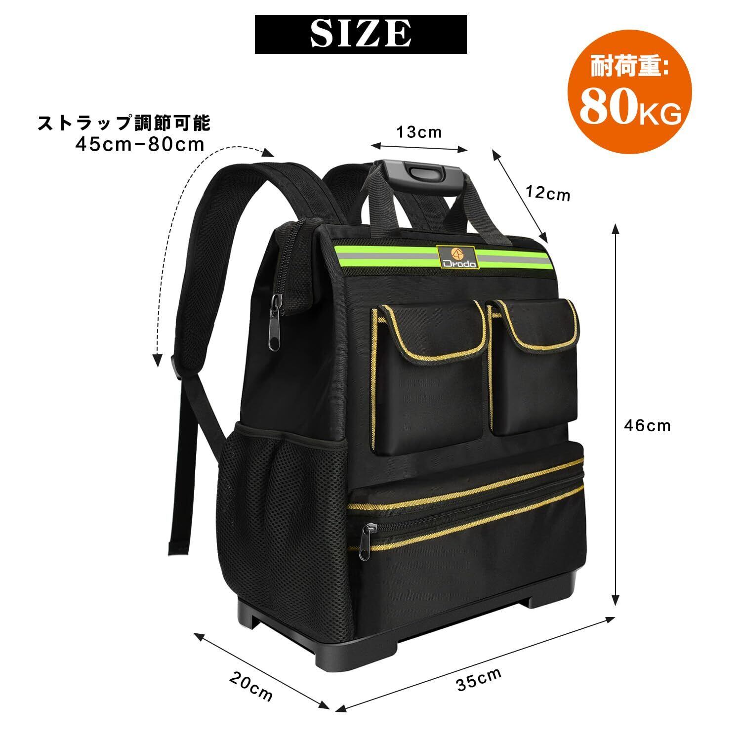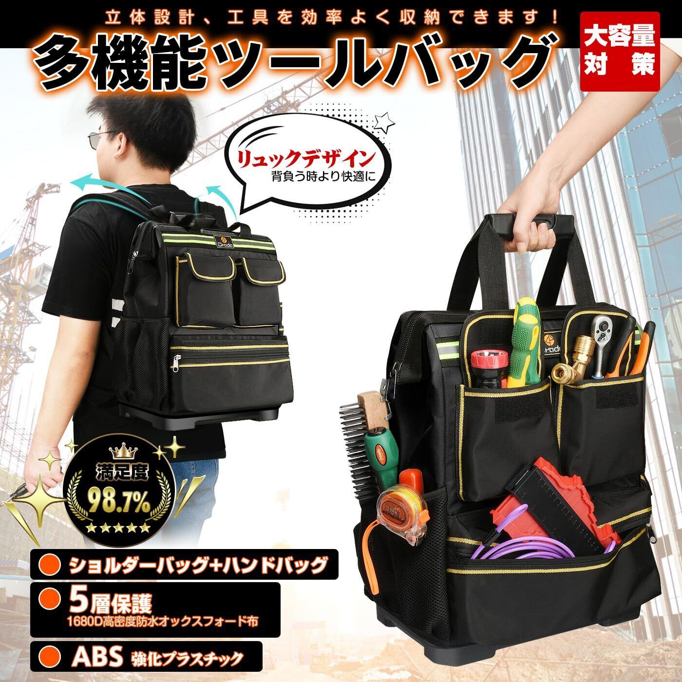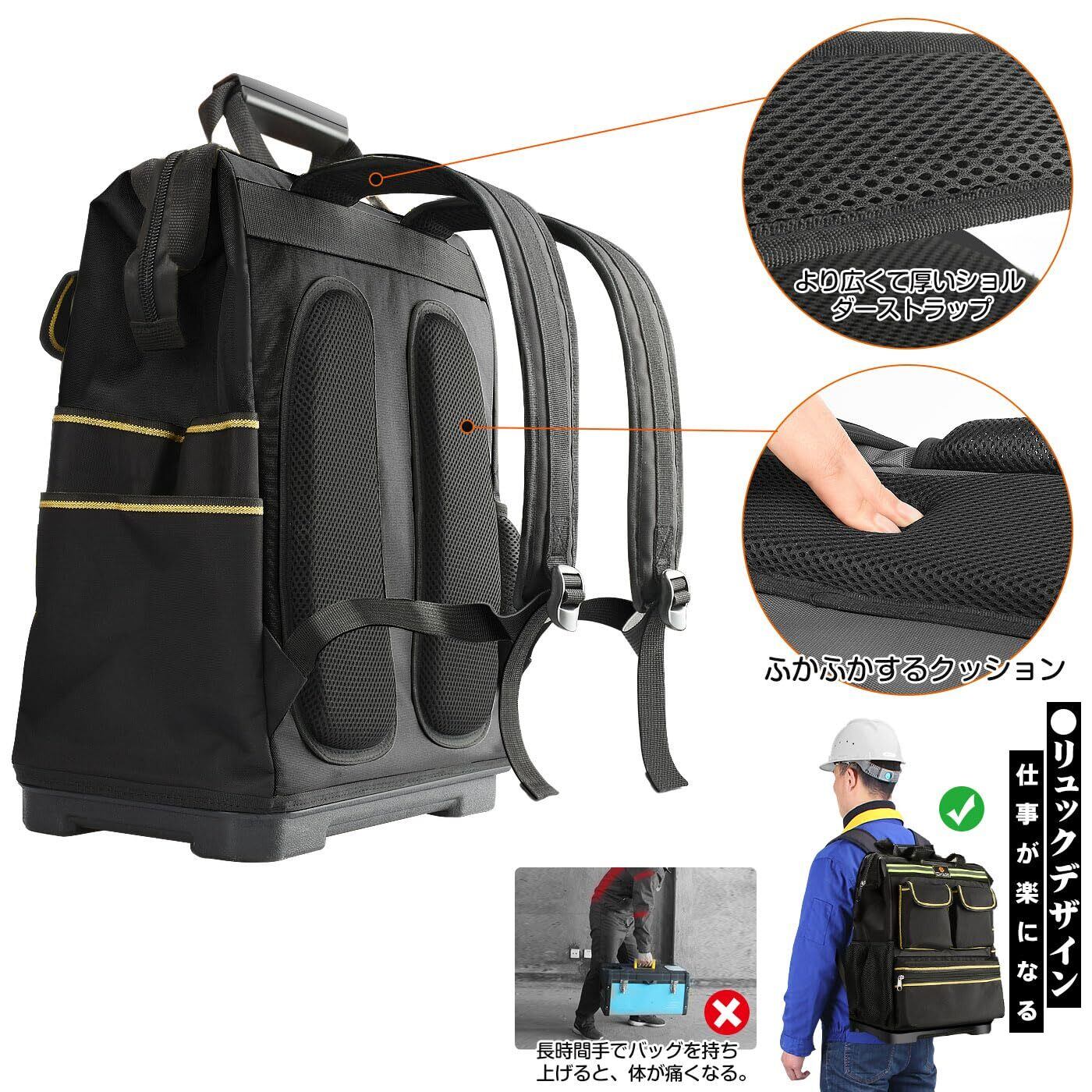 Drado 工具リュック ツールリュック ツールバッグ 工具バッグ リュック 大容量 手提げ 2way 仕切り付き 多機能 工具リュックサック 強化プラスチック底 ハード オックスフォード布製 撥水設計 反射ストリップ付き 工具入れ 工具収納 電工 作業用 アウトドア(ブラック)
