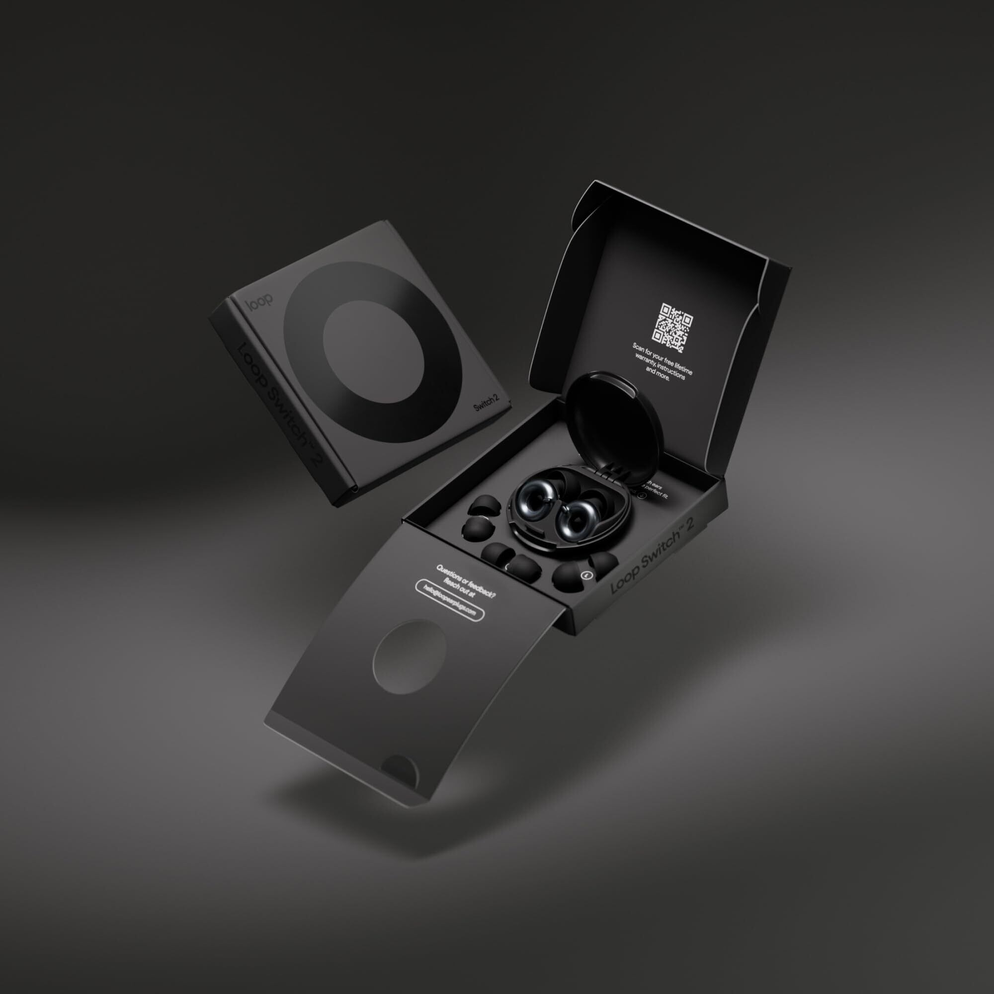 梱包内容 – Loop Switch 2耳栓 x 1セット、Loop Switch 2イヤーチップ x 4組(XS/S/M/L)、安全に持ち運ぶための丈夫なLoop Switch 2 Carry Case x 1個。ケースは耳栓が中で動かないように設計されています。