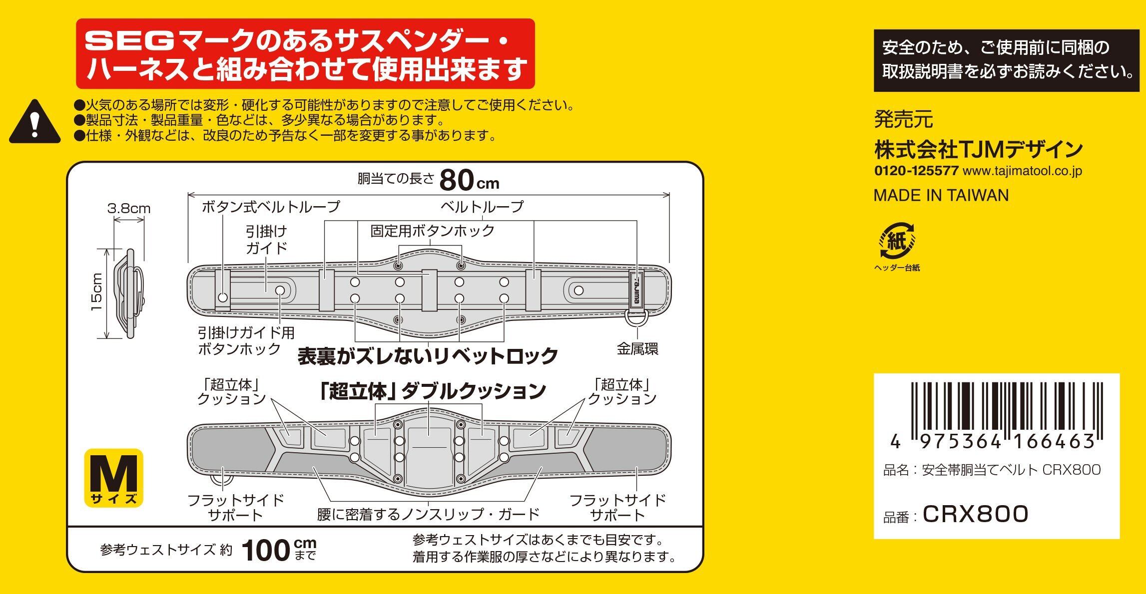 タジマ 安全帯 胴当てベルトCRX800 長さ800mm サポート力を高める幅広設定・超立体ダブルクッション 腰骨が痛くなりにくいサイドサポート形状 ズレにくいノンスリップ構造 タジマフルハーネス・サスペンダーと簡単に取付け/取外し可能