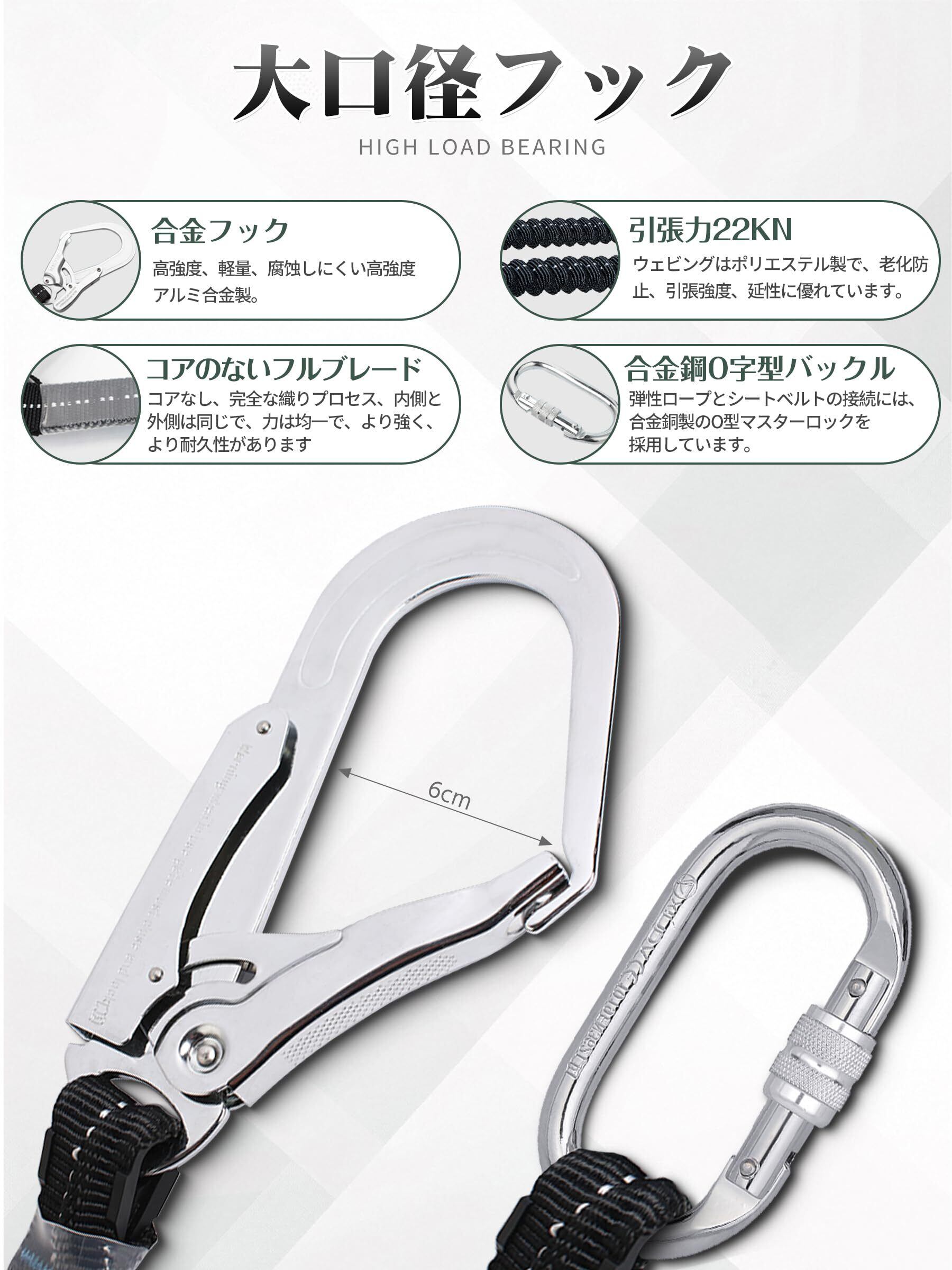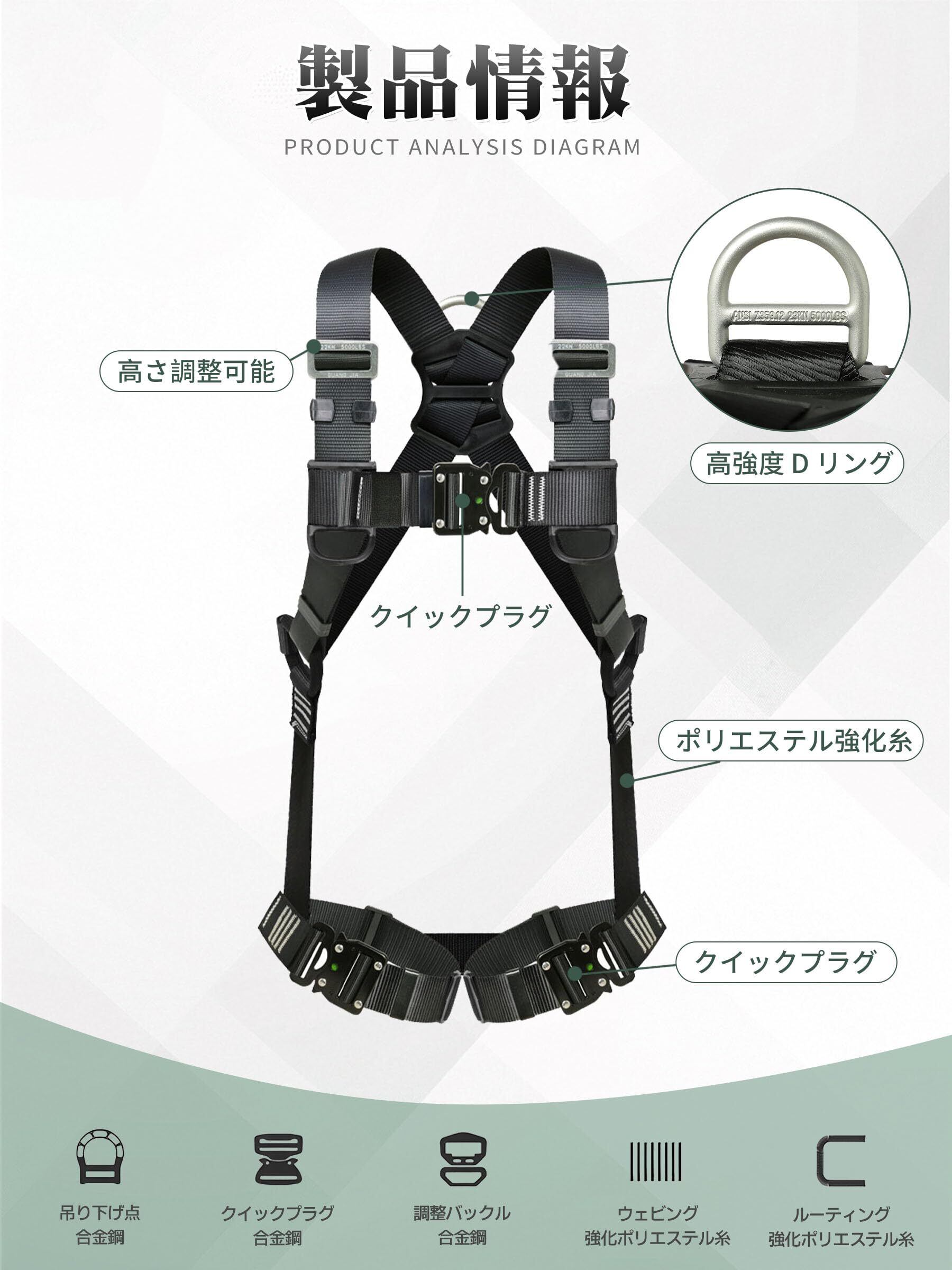 【高品質素材のフルハーネス】安全帯 フルハーネスは高強度ポリエステル素材でできており、耐荷重性、耐摩耗性、耐久性、耐食性などに優れており、作業者の安全を確保します。調整バックルやフックはステンレス鋼で強く引っ張っても問題なし使えます。