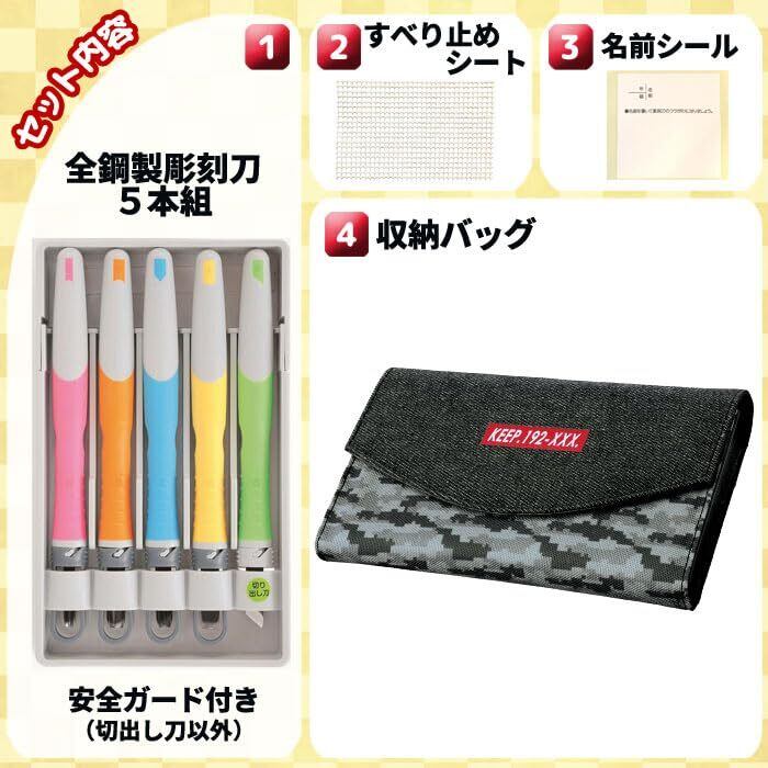 ◆彫刻刀バッグ ◆安全ガード付き全鋼製彫刻刀5本組[平刀・三角刀・大丸刀・小丸刀・切出刀(右用)プラケース入り ◆名前シール ◆滑り止めシート