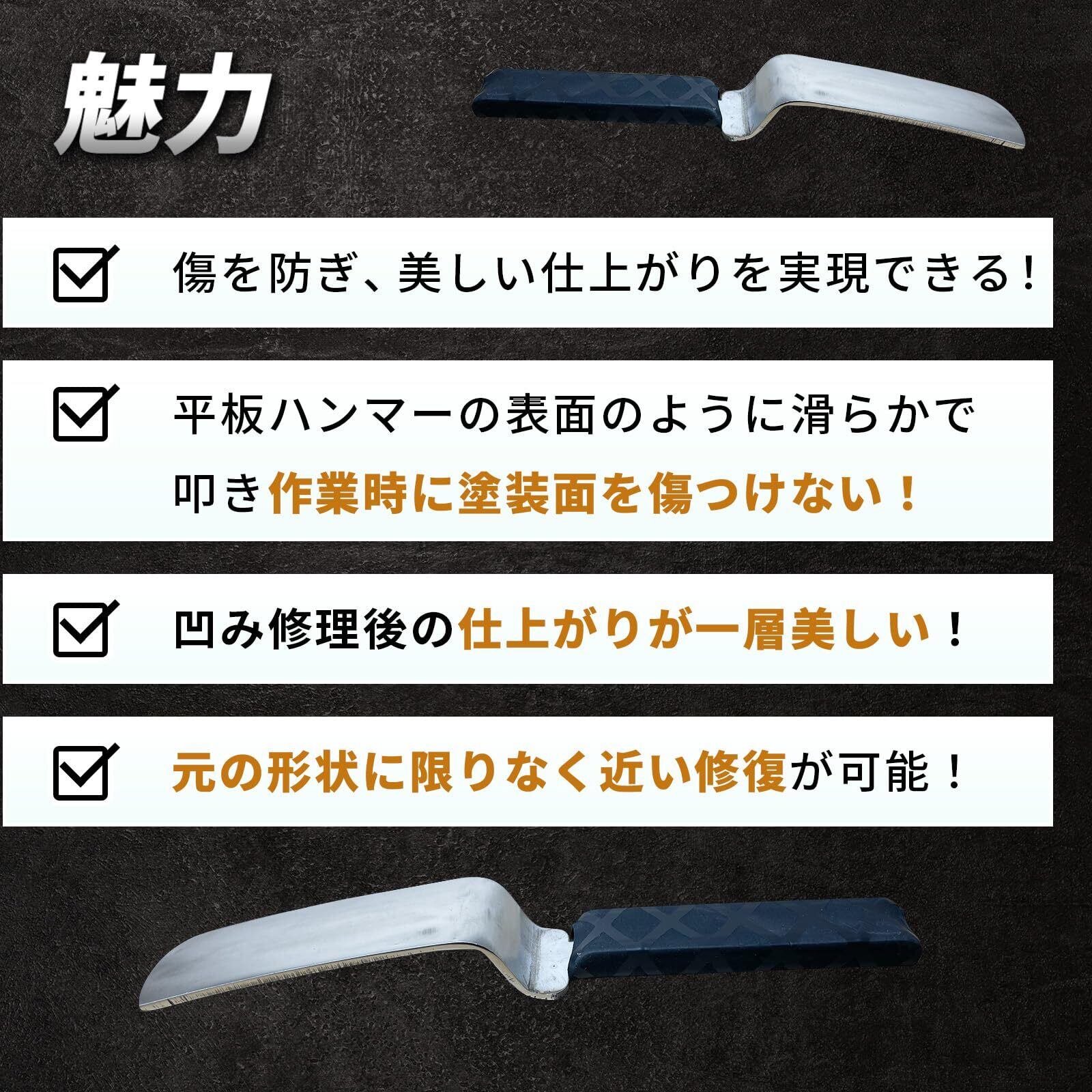 【優れた表面仕上げ】傷を防ぎ、美しい仕上がりを実現! 表面は鏡のように滑らかで平板となっています。フラットのため叩き作業時に塗装面を傷つけにくい板金金槌です。ナラシ作業にも適しており、凹み修理後の仕上がりが一層美しく、元の形状に限りなく近い修復が可能です。スライドハンマー(スライディングハンマー)や引っ張り工具と併用することで、より円滑な板金作業が可能となります。