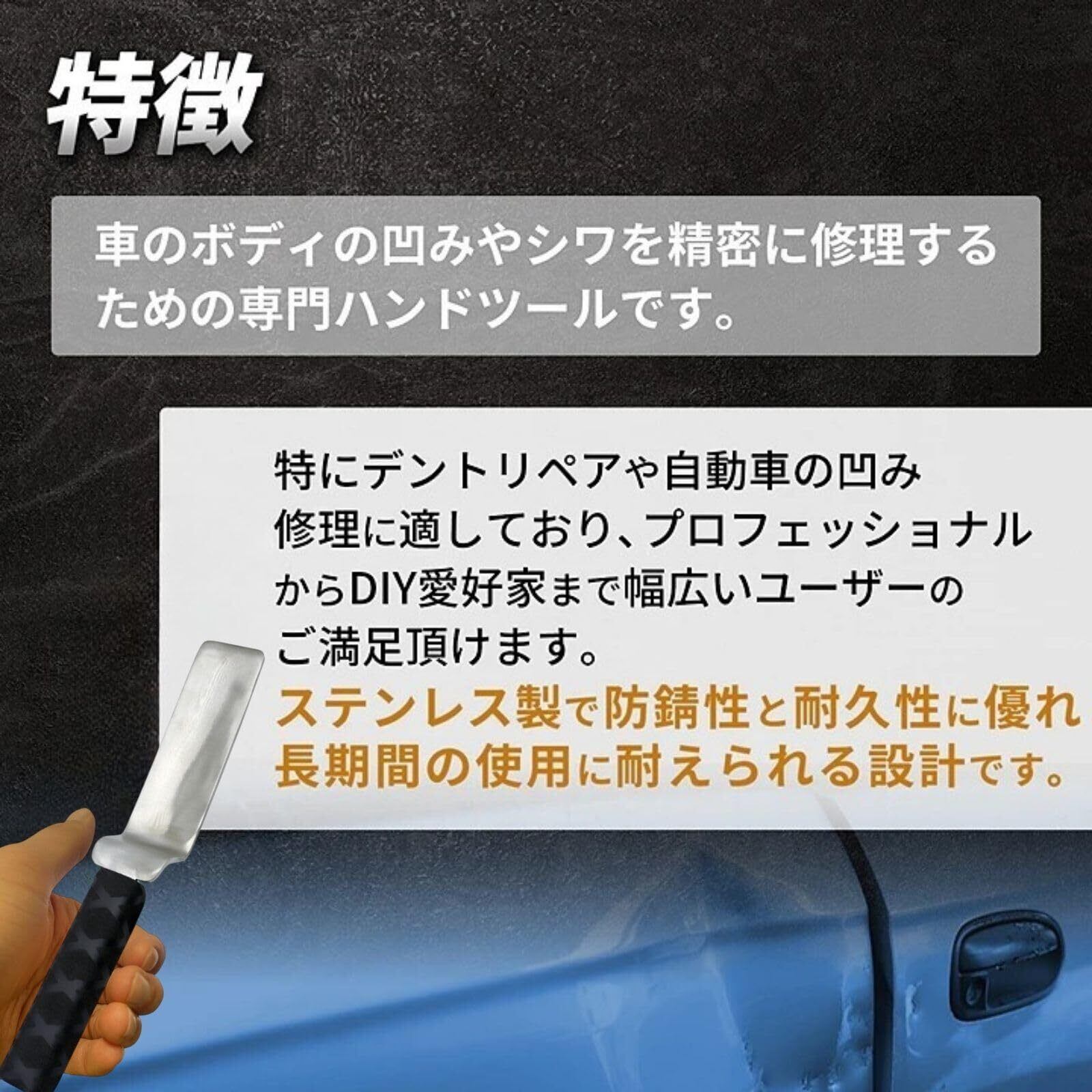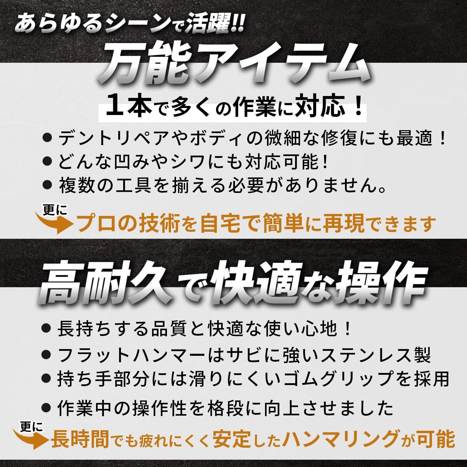 【デントリペアの必需品!】 この板金ハンマーは、車のボディのへこみ直しやシワを精密に修正するための専門ハンドツールです。プロフェッショナルからDIY愛好家まで幅広いユーザーにご満足いただけます。ステンレス製で防錆性と耐久性に優れ、長期間の使用に耐えられる板金工具です。
