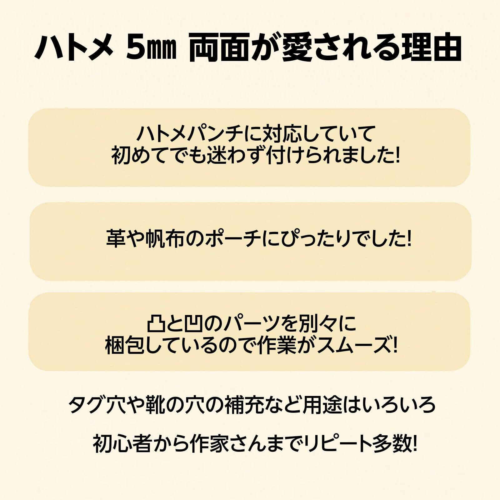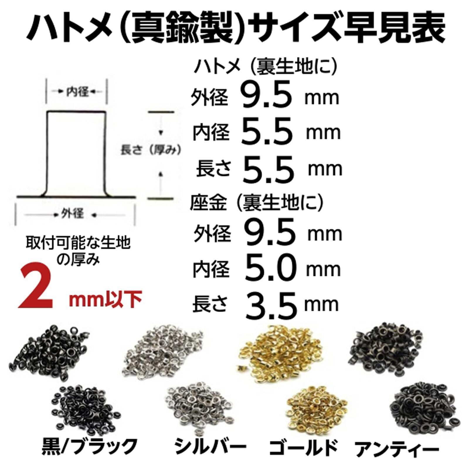 外径9.5mm/内径5.5mm/長さ5.5mm|厚さ2mmまで対応 取り付け可能な生地の厚みは約2mm以下。レザーや帆布などに最適な5mmサイズです。