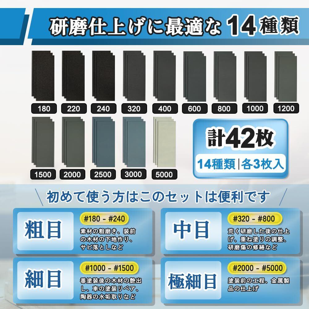 紙やすり 42枚14種類 180~5000番 耐水ペーパー セット 研磨シート 230×93mm サンドペーパー (180 220 240 320 400 600 800 1000 1200 1500 2000 2500 3000 5000 各3枚入) 紙ヤスリ 耐水ヤスリ ヘッドライト磨き 金属 木工 DIY作業に キッチンの掃に