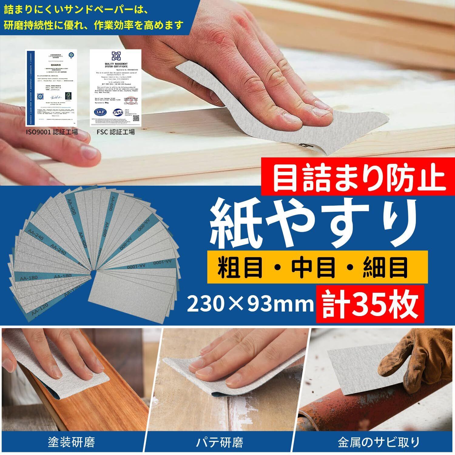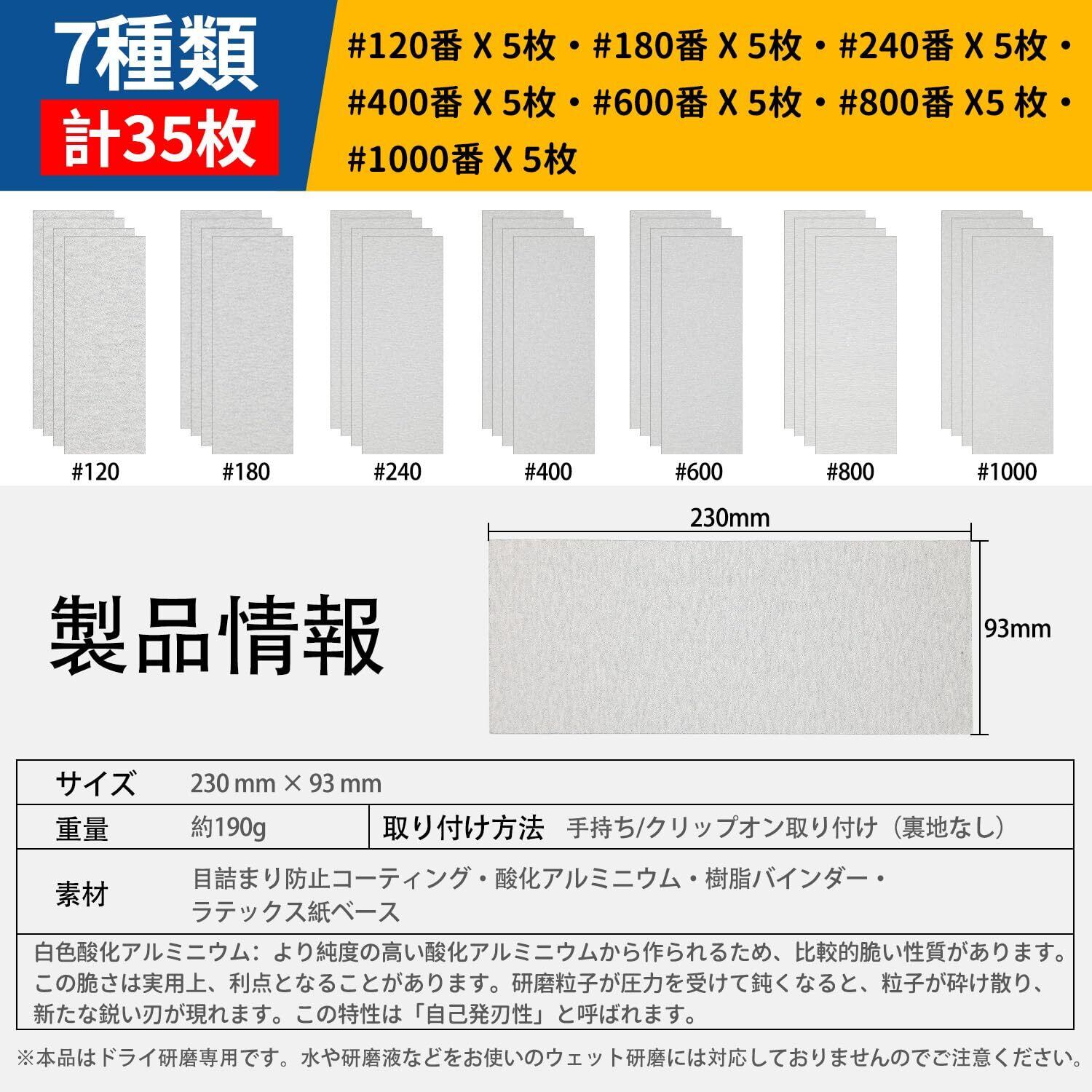 【数量限定】紙やすり セット 35枚7種類 目詰まり防止 サンドペーパー 120~1000番 230×93mm 紙ヤスリ (120 180 240 400 600 800 1000 各5枚入り) オービタルサンダー用 空研ぎペーパー 塗装除去 金属磨き 木工 DIY作業に