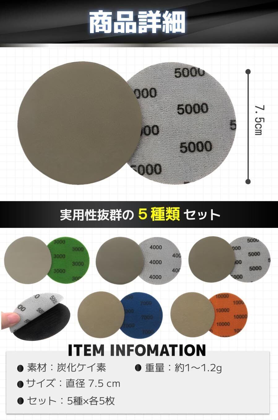 【商品特徴】①優れた研磨効果を発揮:表面処理や艶出し作業などにぴったり/②高硬度で耐摩耗性抜群:丈夫で破れにくく水にも強い!/③マジックテープ式:取り付けも取り外しもとても簡単!/④メンテナンスに最適:愛車や家具など様々なお手入れに
