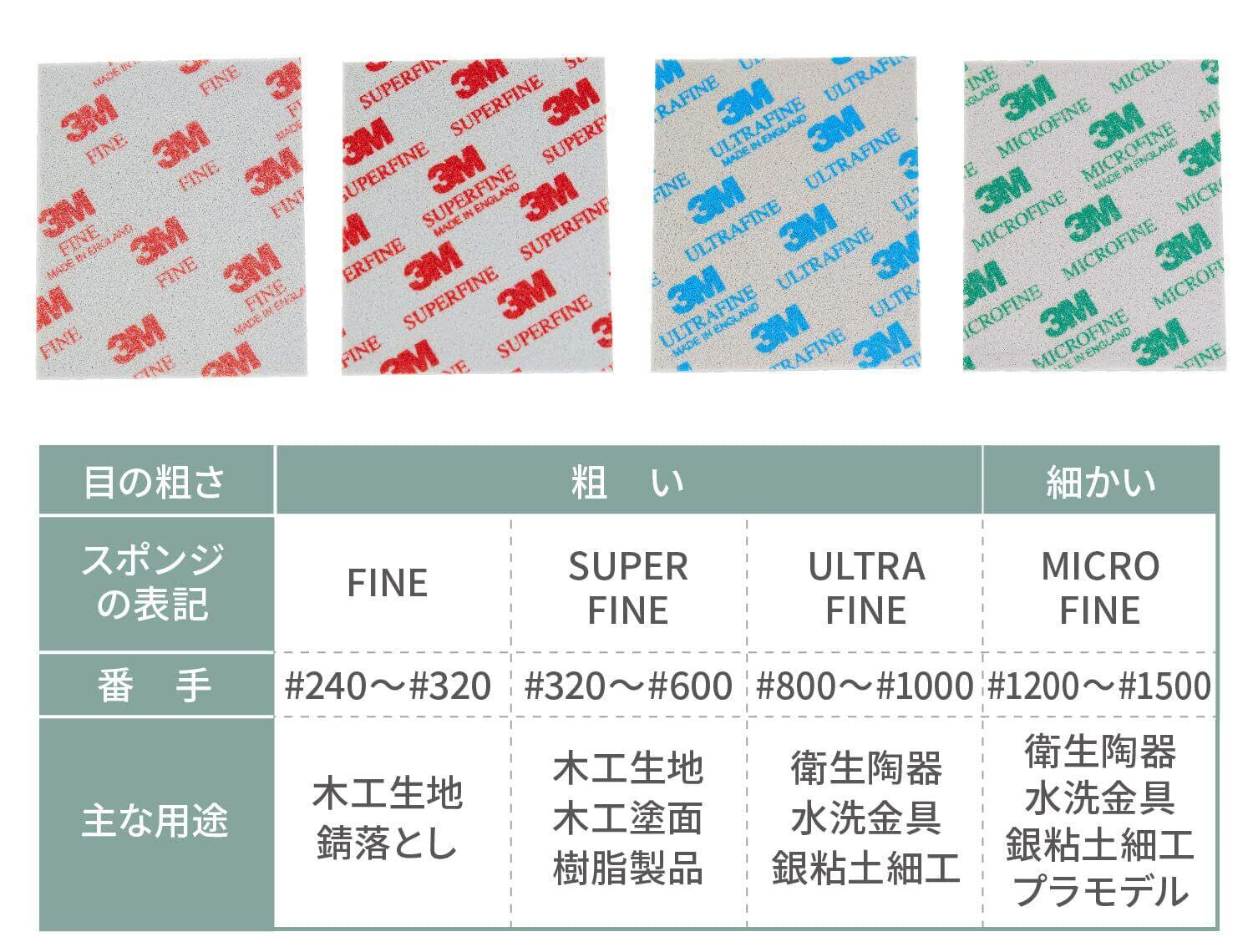 曲面によくなじみ、切れ味が持続する3Mのスポンジ研磨材,グレード : Fine #240-320、Super Fine #320-600、Ultra Fine #800-1000、Micro Fine #1200-1500