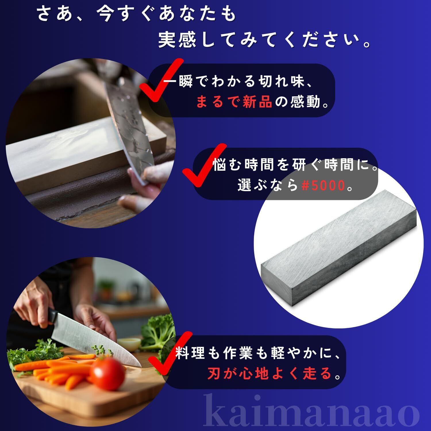 ︎ 穏やかな研磨力 人造砥石に比べて柔らかく、時間をかけてじっくりと研げるので、料理の楽しさもアップ!