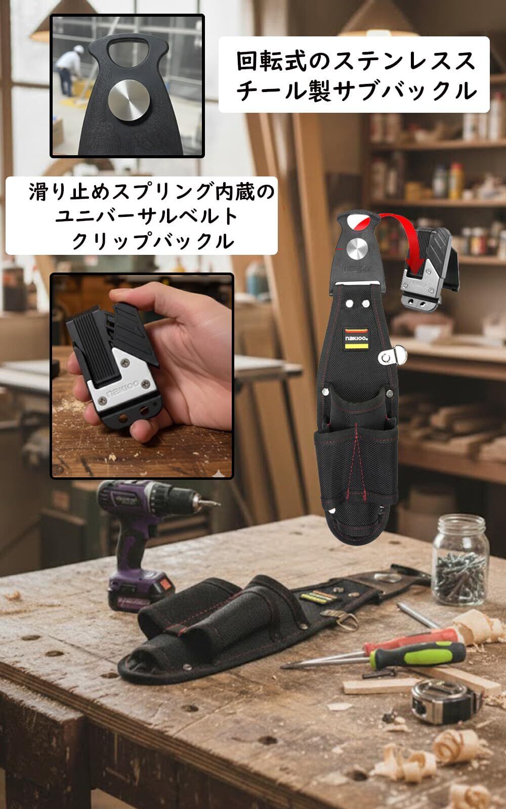【製品の用途】 バッククリップ式デザインにより、簡単に着脱可能。ベルトに装着して腰に巻いて使用できるほか、ガレージや壁面に掛けて保管することもできます。バックル固定式で安定感があり、作業時もずれにくい構造です。 ※本製品にはベルトおよび工具は付属していません。