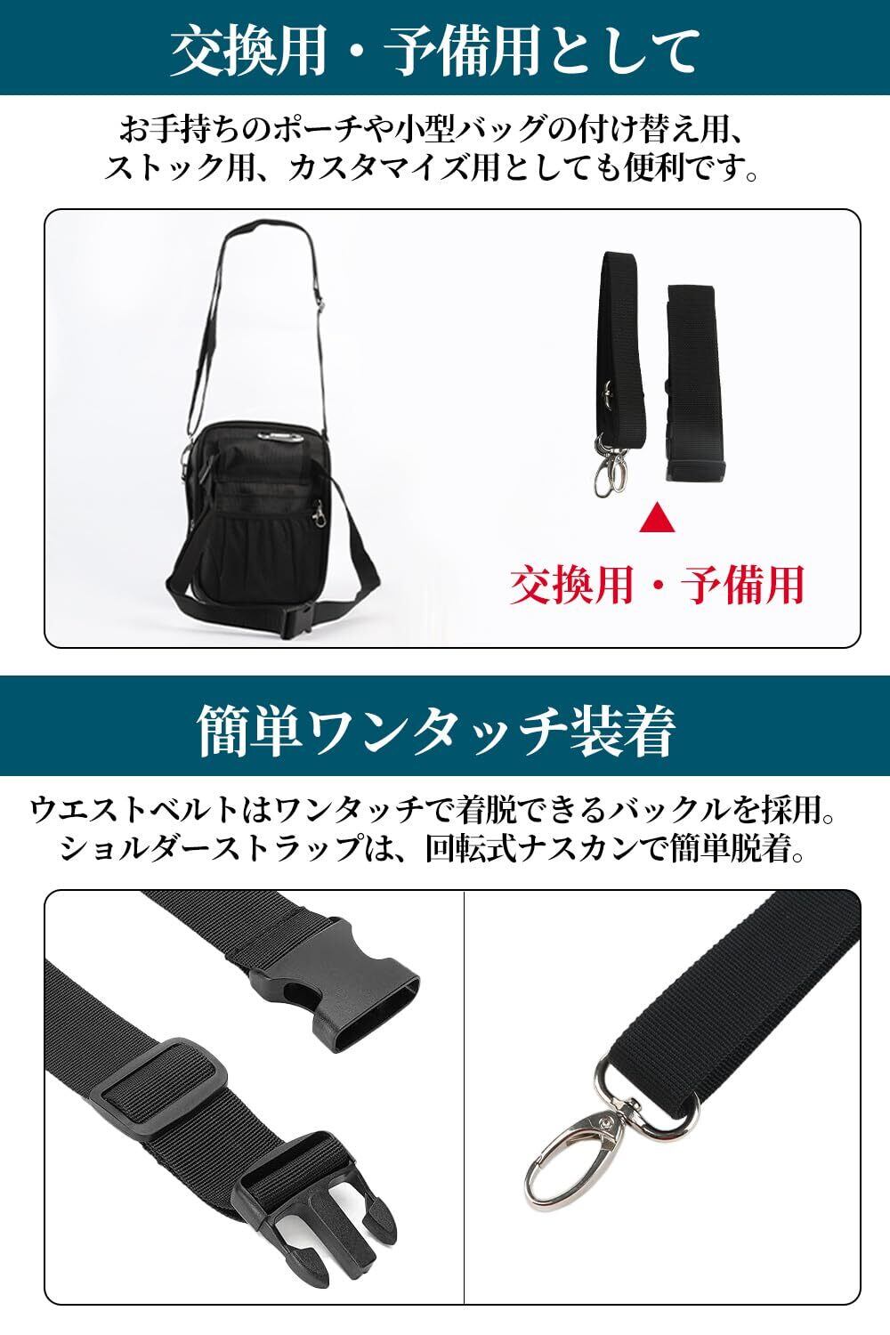 ●作業用ポーチ、 仕事用ポーチ、シザーバッグなどに使える業務用ウエストベルトとショルダーストラップ。■【交換用・予備用として】お手持ちのポーチや小型のバッグの付け替え用、ストック用、カスタマイズ用としても便利です。■【簡単ワンタッチ装着】ウエストベルトはワンタッチで着脱できるバックルを採用。ショルダーストラップは、回転式ナスカンで簡単脱着。フックできるリングがあるポーチ、バックであれば装着可能です。