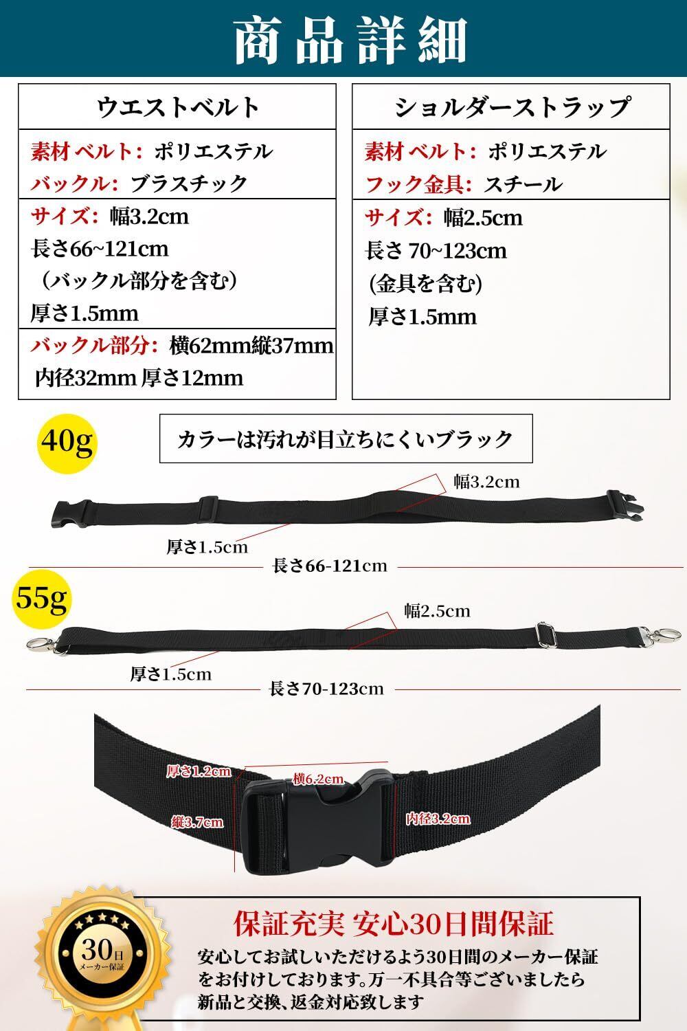 ■【ウエストベルトの特徴】穴がないので、自分の体型に一番フィットする長さで調整可能。便利なサイドリリースバックルで 簡単に長さを調整できます。(最大120cmまで)差し込み型で、装着の際、ベルトの余りが垂れ下がることのない仕様です。ベルト素材は耐久性が高いポリエステルを使用、軽量で耐摩耗性、速乾性があり、シワになりにくい素材。バックル部分は弾力性、耐久性があるプラスチック素材。