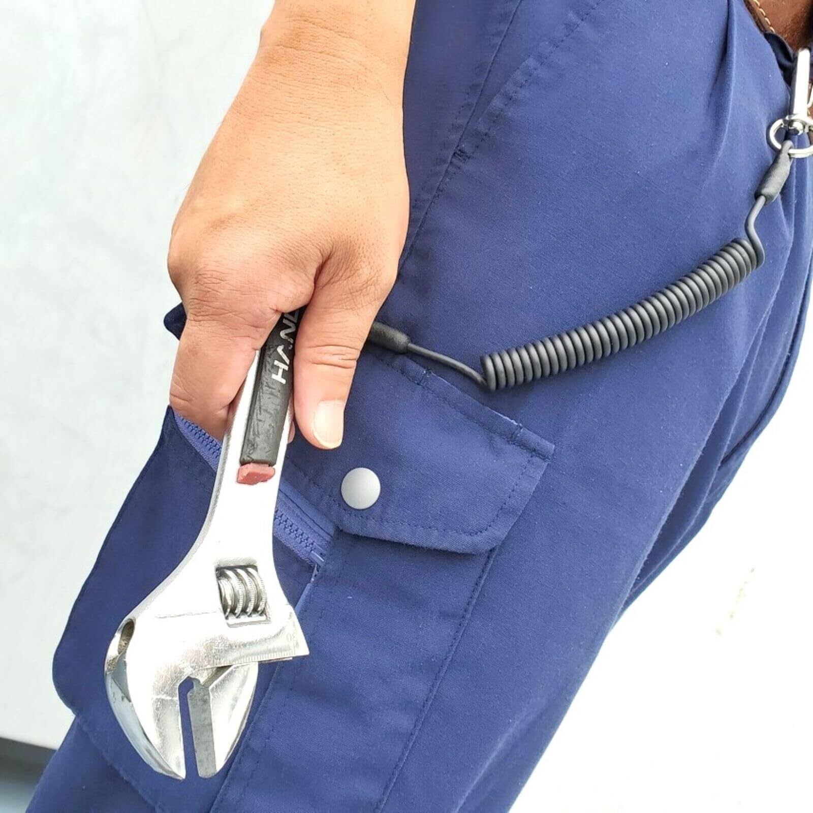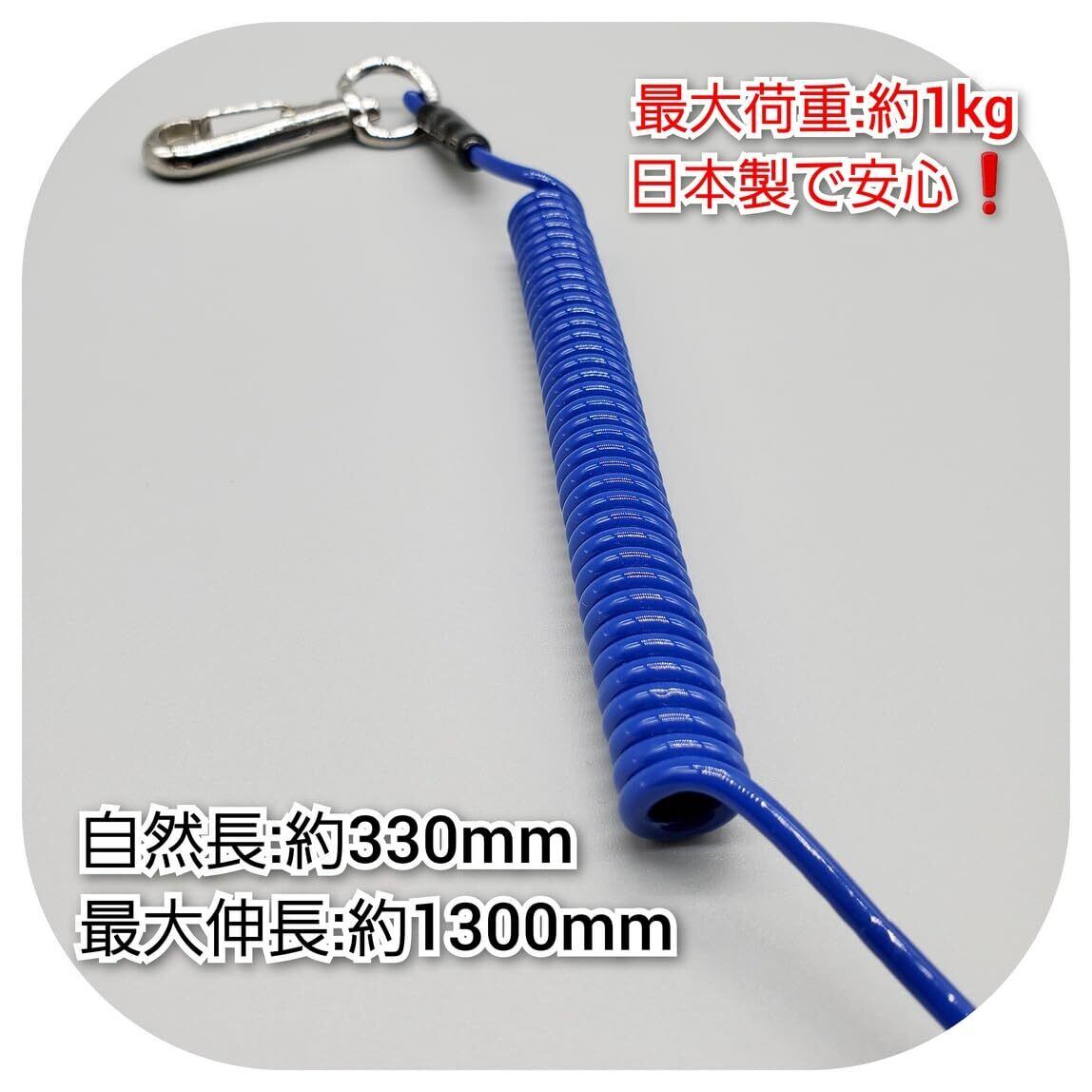 【スパナ用セーフティーコード2本セット】日本製の高品質なスパナ用落下防止コード。自然長は約330mm、最大伸長時は約1300mm。ステンレスワイヤー入りのコイル部分と二重リング付きの設計が特徴的で、安全性をしっかり確保。最大荷重は約1kgまで対応可能。
