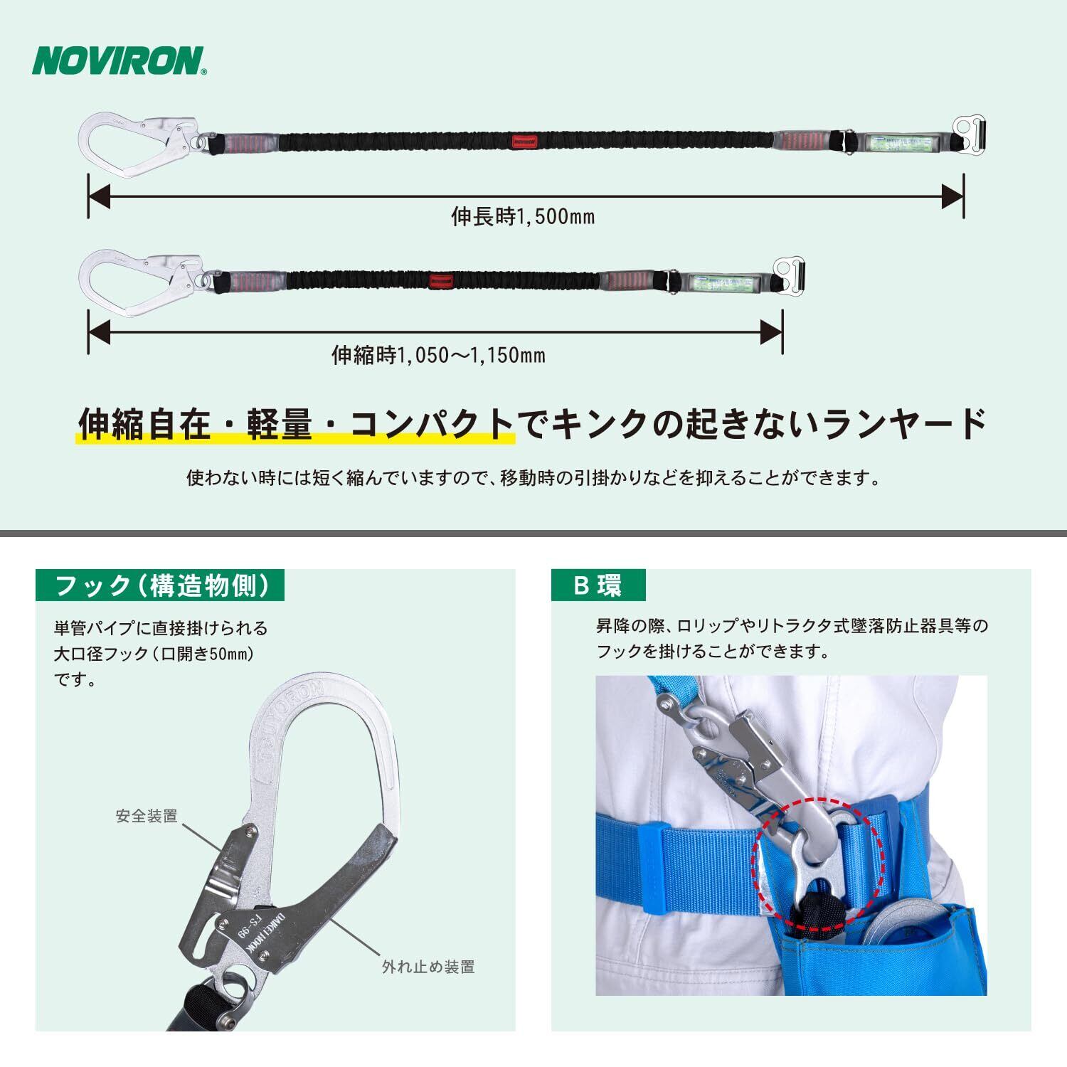 伸縮ロープ式のランヤード”ノビロン”とスチール製のスライドバックルを採用した胴ベルトのセットモデルです。