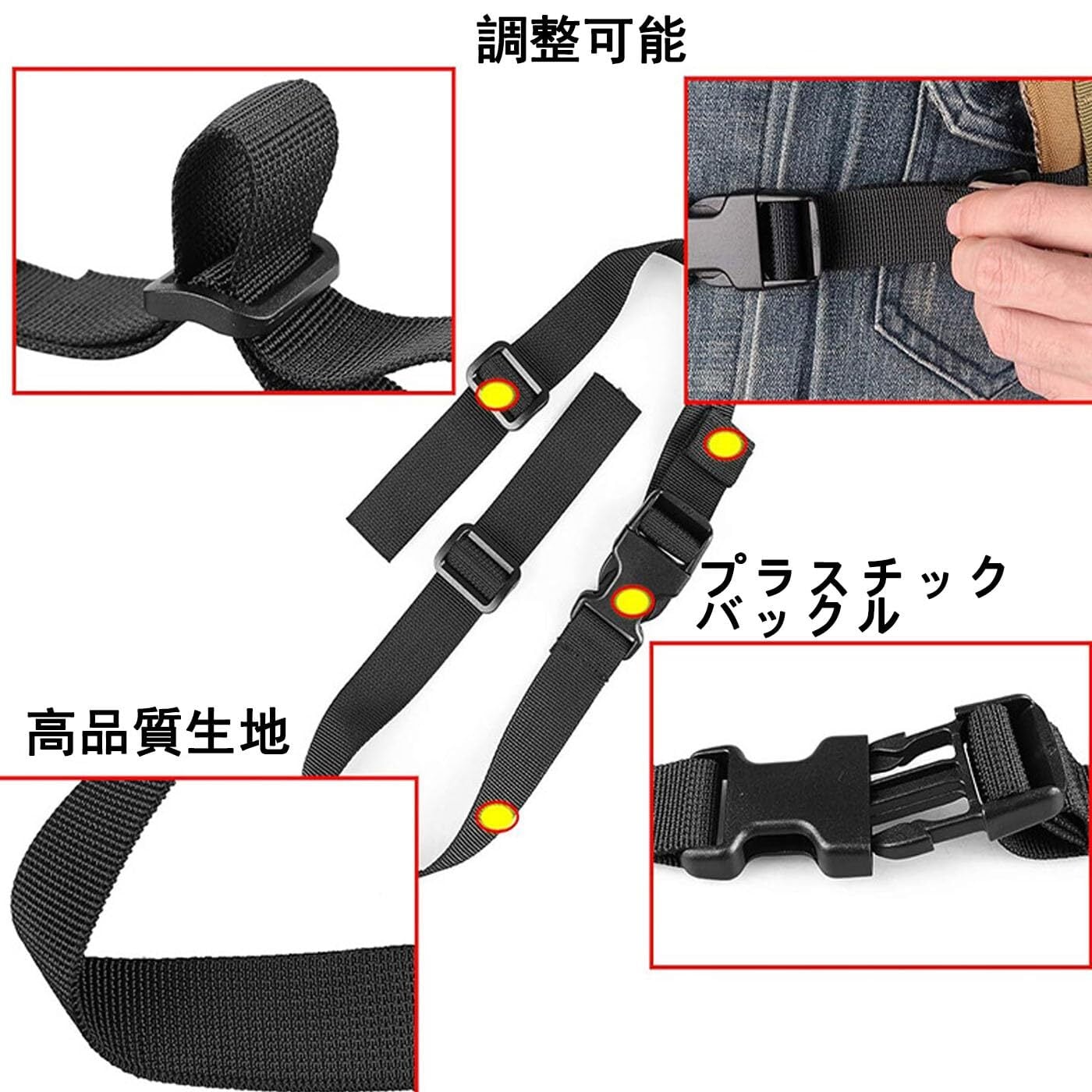 3.長さは約90 cmで、小柄でも大柄でも、適切な長さに調整できます。幅は約2.5 cm、幅は程よく、くびれもなく、安定して力を出すことができます。材質はさらにしっかりしている--耐久性のあるナイロン生地は屋外の打撲に耐えられ、滑り止めの固定ボタンが付いているので、リュックサックが揺れても、しっかりと位置をロックでき、どのように動いても緩まない。持参したD字フックもプラスアイテムで、丈夫で使いやすく、何を掛けても安心です。