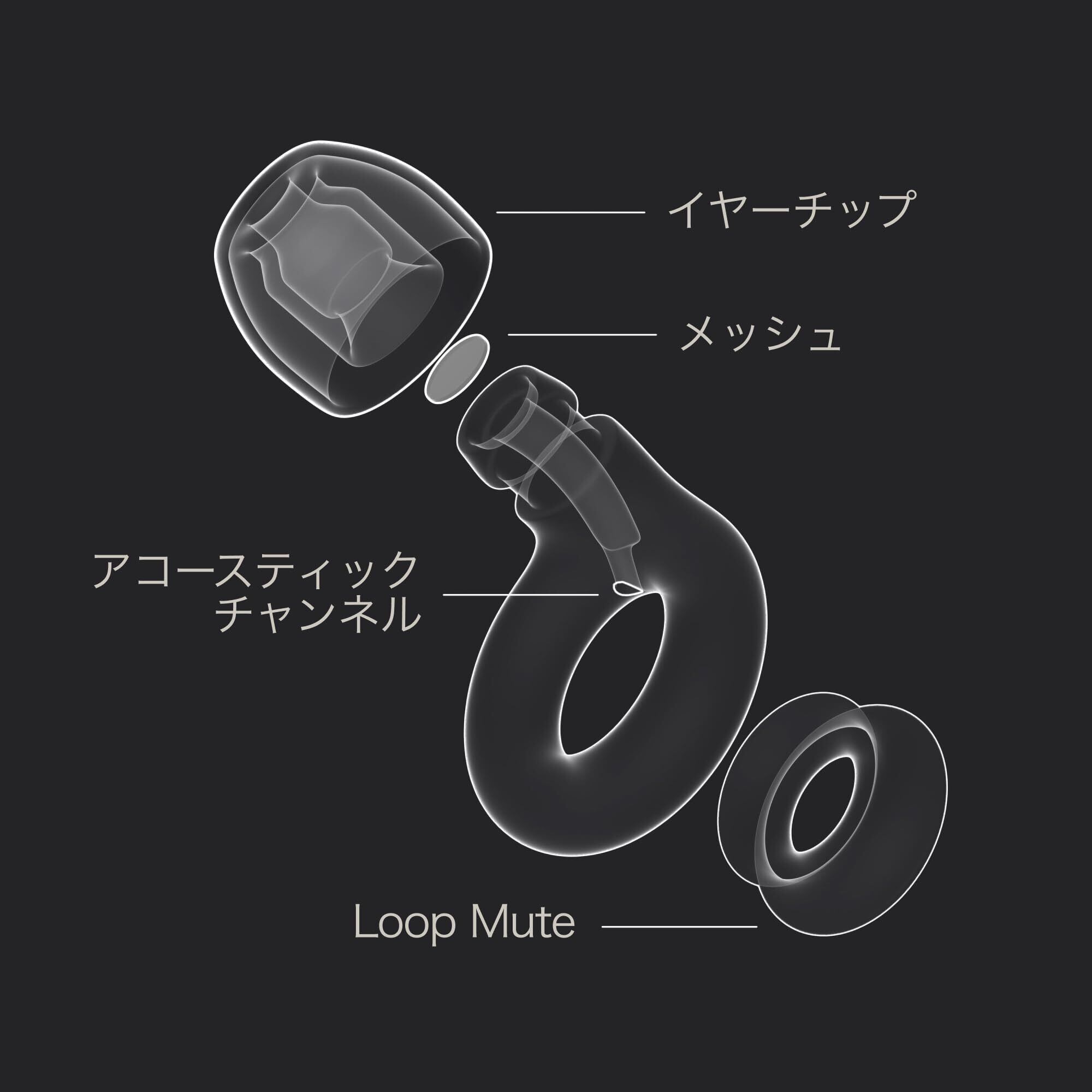 梱包内容 – Loop Engage 2 Plus耳栓 x 1セット、Muteアクセサリー x 2組(ブラック・ホワイト各2個)、シリコン製イヤーチップ x 4組(XS/S/M/L)、フォーム製イヤーチップ x 3組(S/M/L)、持ち運び便利なキーホルダー型Carry Case x 1個。