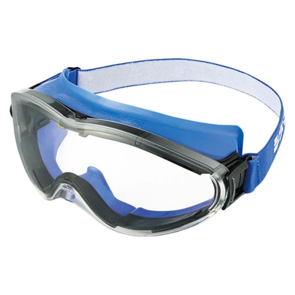 レンズ外側にハードコーティングを施すことで傷がつきにくく、耐薬品性に優れ、汚れが付着しにくいです。調節可能で肌へのあたりが優しいゴム織紐を使用しています。ベンチレーター(換気口)が無く、180°見渡せるパノラマレンズです。