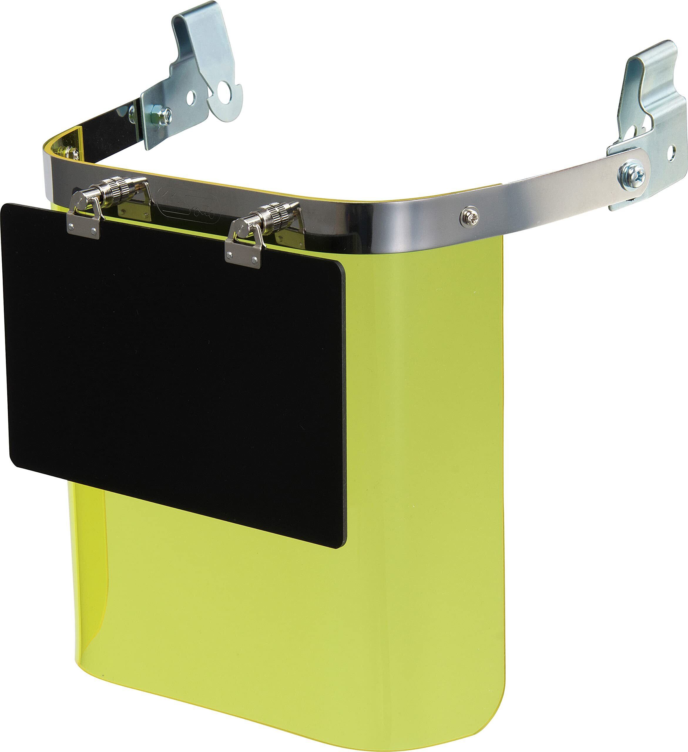 金具に差し込むヘルメット取付式防災面。前プレート付。正面が平らな角型レンズ。