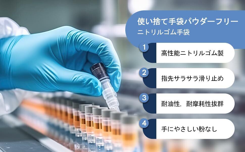 【高品質ニトリル手袋】純正ニトリルゴムを使用しております。非合成または混合ニトリル。破れにくて,弾性、浸透防止!高性能ニトリルゴム製使い捨て手袋なので、耐油性・耐摩耗性・突刺し強度に優れています。