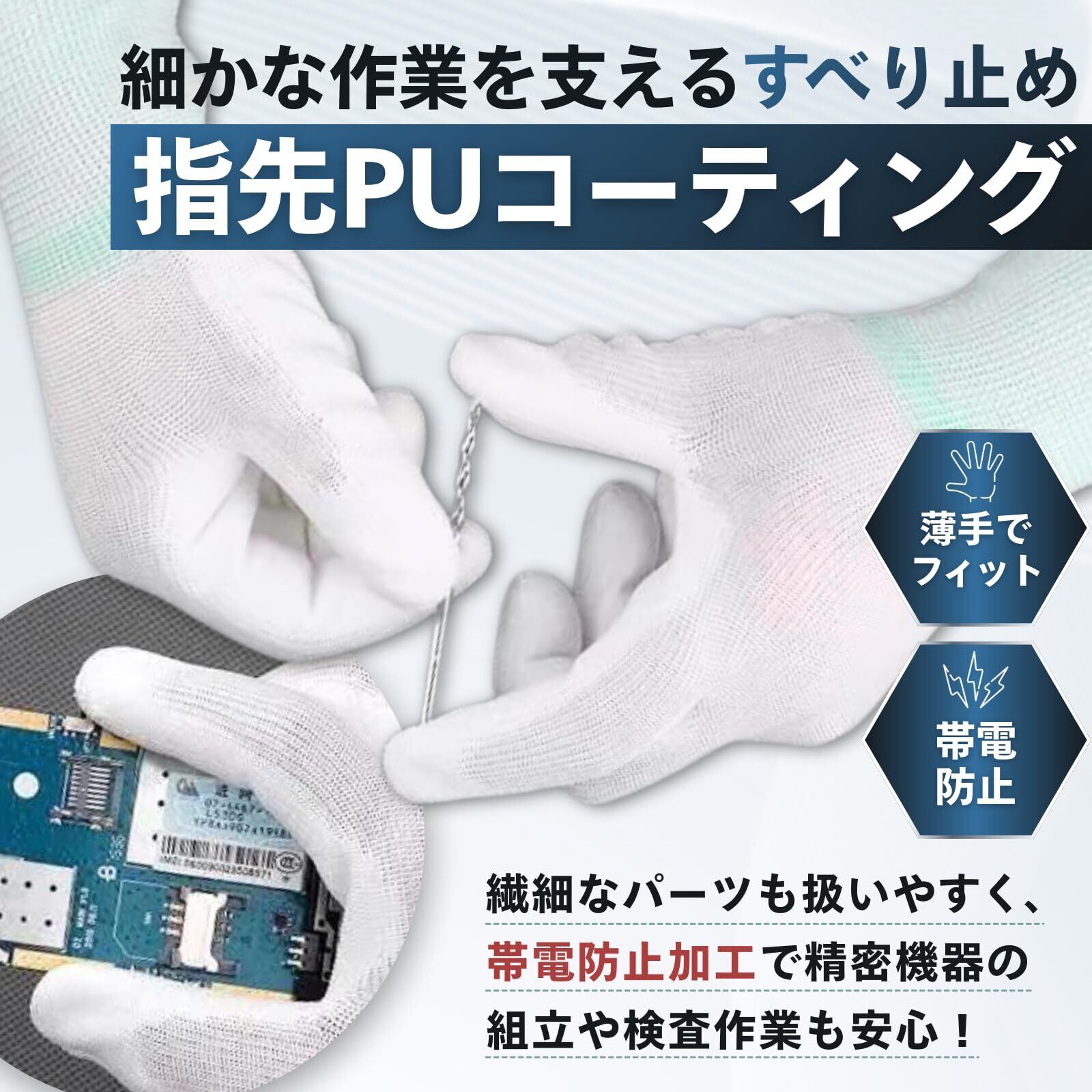 【高性能な指先コーティング】指先がPUでコーティングされた作業用手袋です。帯電防止・すべり止め効果があり、また軍手より生地も薄手ですので、指先を使う細かい作業に適した手袋です。【快適な付け心地】さらっとした装着感で通気性にも優れており、手首部にはほつれを防ぐオーバーロック加工をしているため、丈夫に仕上がっております。【細かい作業に最適】軍手・作業用グローブとして、精密機器の組み立て作業、製品の検査作業、電子部品組立作業、印刷、園芸、半導体工場、電子計測等の業務用など、様々な用途にお役立て頂けます。【お得なセット販売】12組24枚のお得セットで経済的。S、M、Lのサイズ展開で最適なサイズをお選びいただけます。