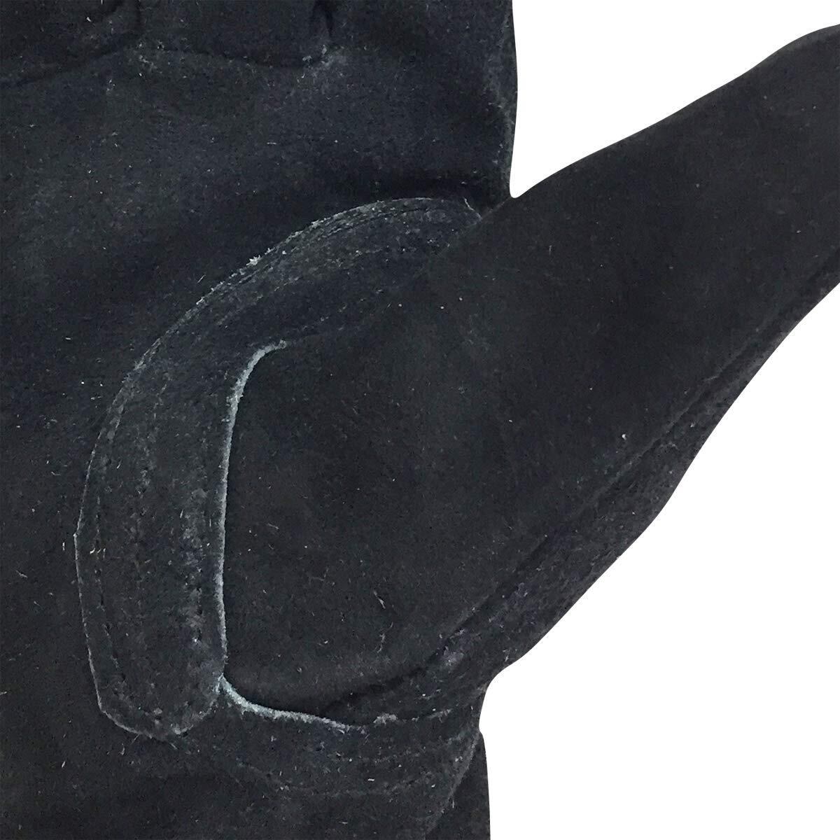 牛床革のバット部とショルダー部を使用したAグレード床革手袋。しっかりと黒く染めました。マジックタイプによりしっかりフィット。内綿付で夏はさわやか、冬は暖かい。