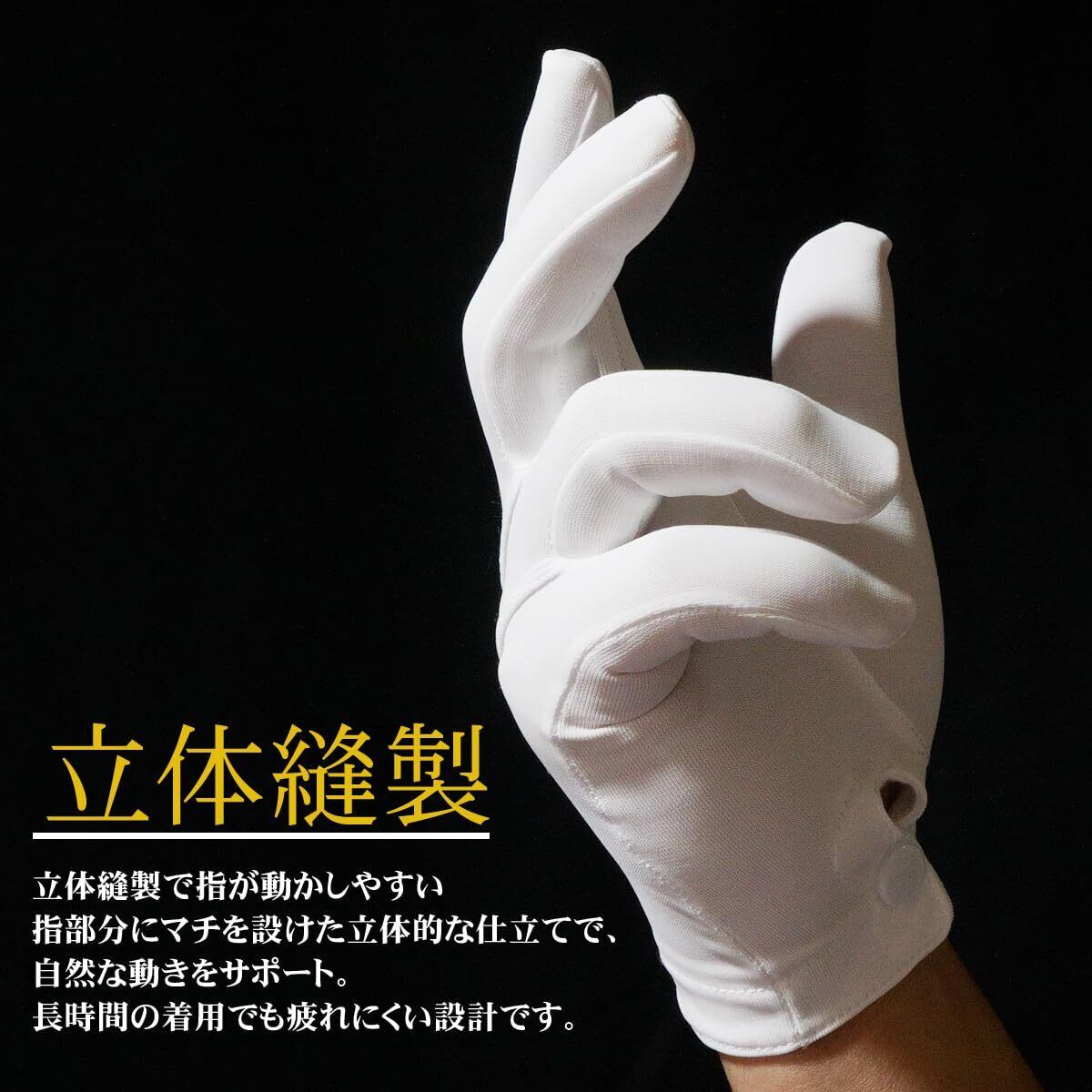 【指先マチ付きの立体縫製】指が動かしやすい設計で、接客・運転・式典などの動作もスムーズ。快適なフィット感を実現しました。【幅広い用途とサイズ展開】S〜LLの4サイズ展開。結婚式・葬儀・式典・接客業・選挙事務所・応援団など、あらゆる礼装シーンに対応します。
