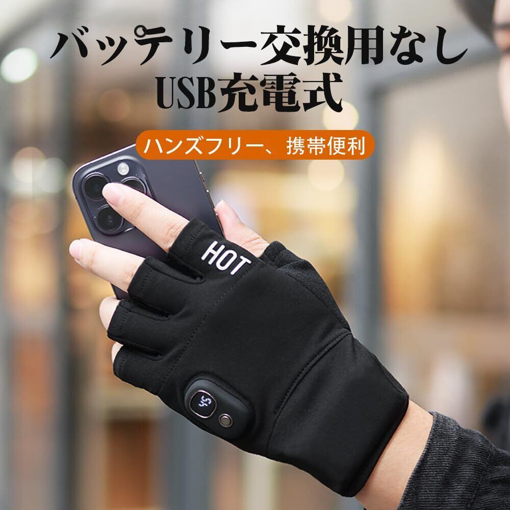 【限定セール】電熱グローブ ヒーター手袋 バイク USB充電式 ヒーター 指ぬき 両面発熱 5段温度調整 2000mAh 温度ディスプレイ 指なし 電熱手袋 薄手 インナー バイク 滑り止め 作業 パソコン作業 男女兼用 アウトドア 冬 防寒 通勤 通学 ブラック フリーサイズ