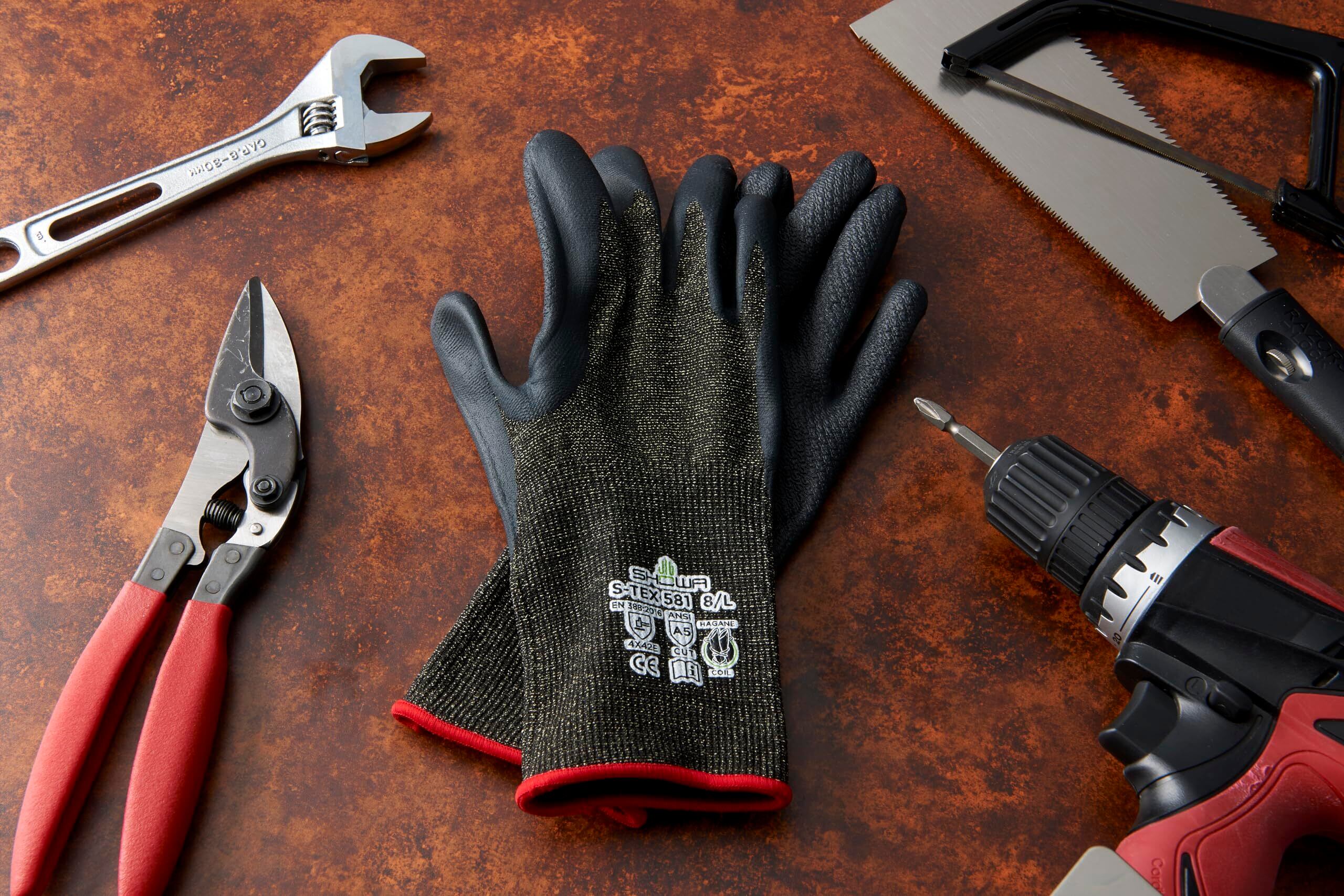 ハガネコイルテクノロジーを採用し、薄くても強度に優れる発泡ニトリルゴムを手のひらにコーティングした『S-TEX 581』