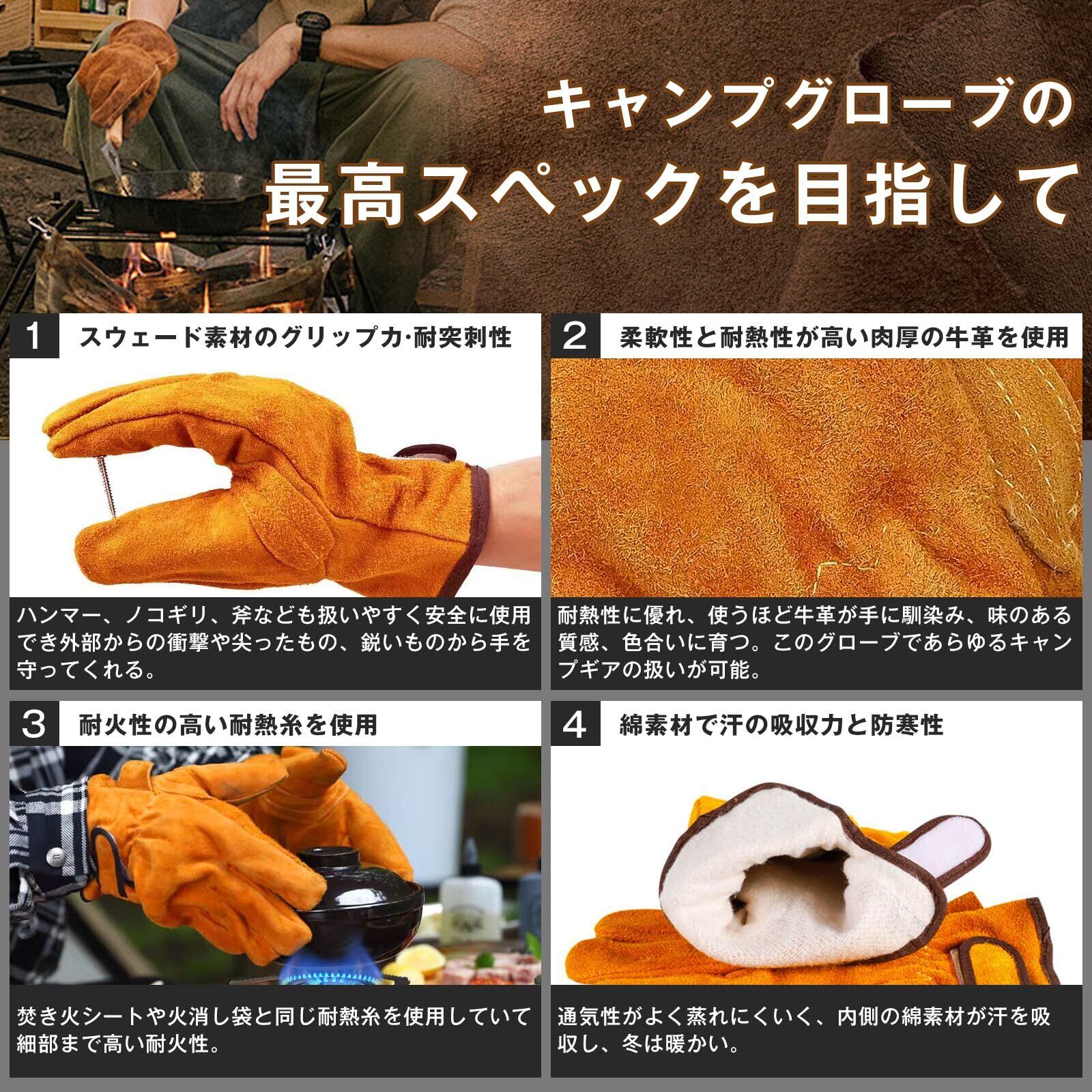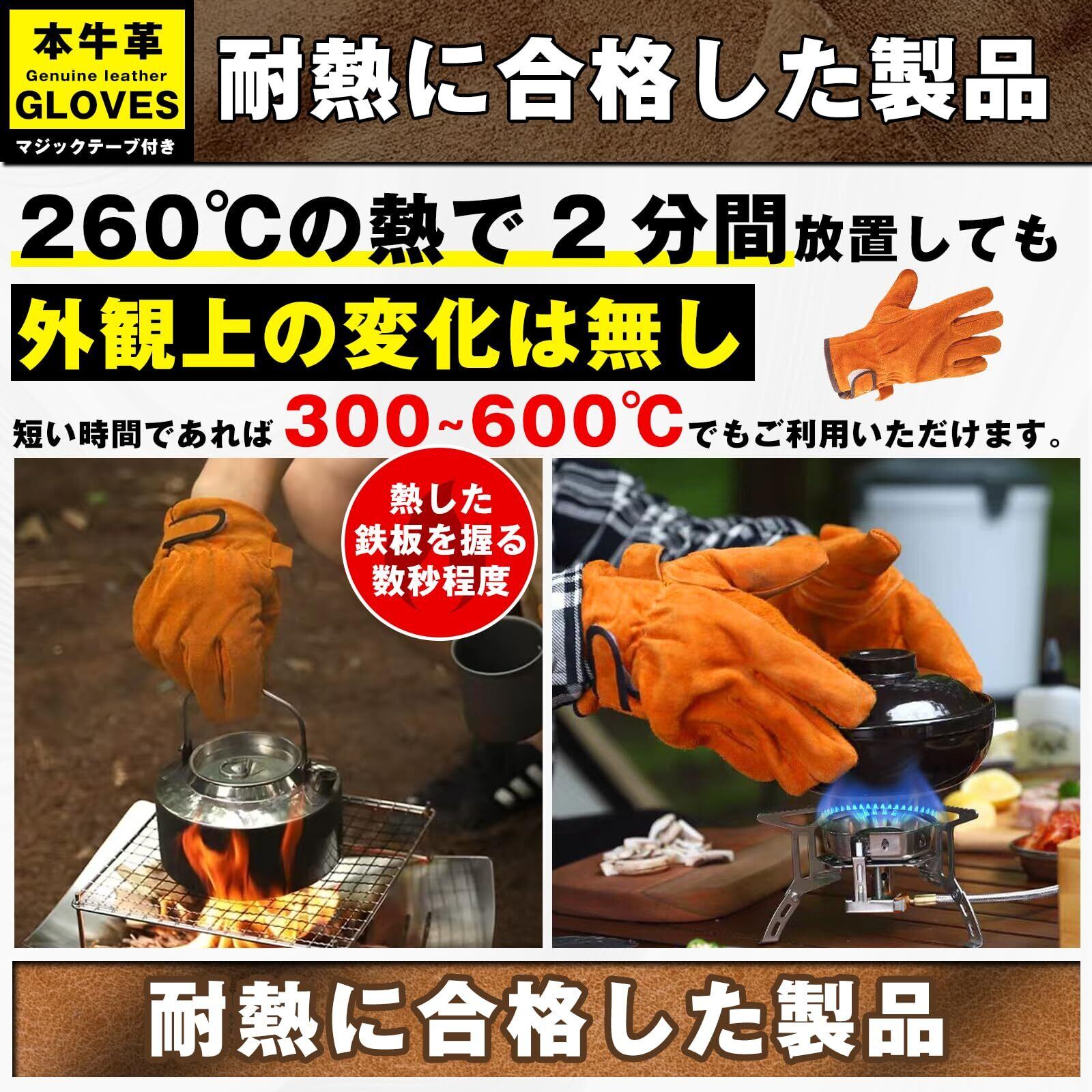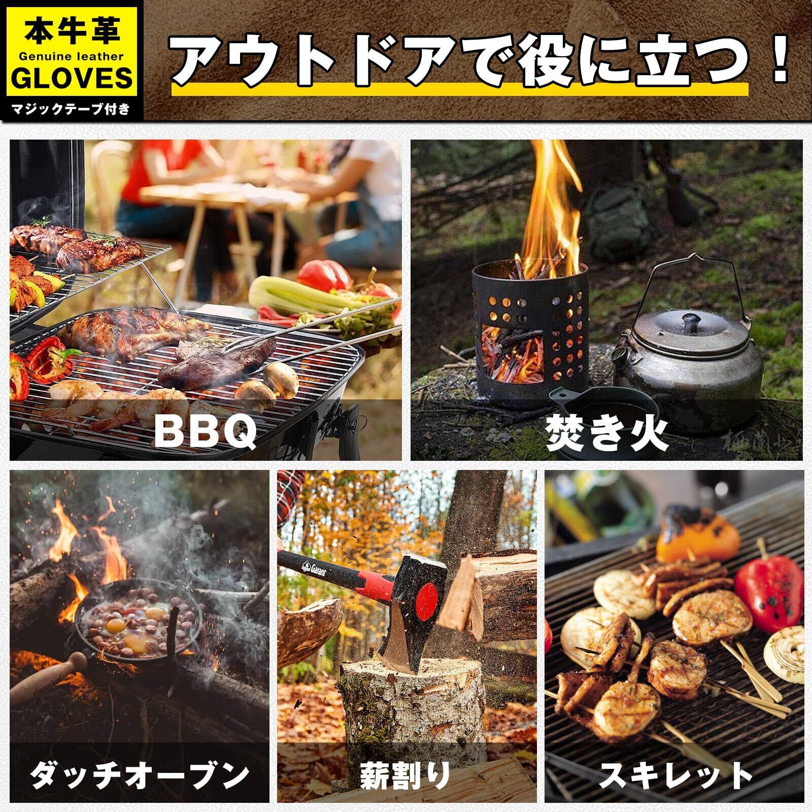 【大活躍本革手袋】バーベキューやキャンプ、アウトドアをする中で、焚き火?炭火調理は欠かせません。そんな時に、ちょっとおしゃれな耐熱手袋は、実用面でもおしゃれなアイテムとしても活躍します。実用面では火力調節のために燃え盛る薪の配置を直すくらいなら余裕で行えます。この耐熱グローブは手首までガードしてくれるので、高熱を防ぎ、焚き火の火起こしやバーベキューの網替え、炭の継ぎ足しなど、安心してバーベキューを楽しむことができます。