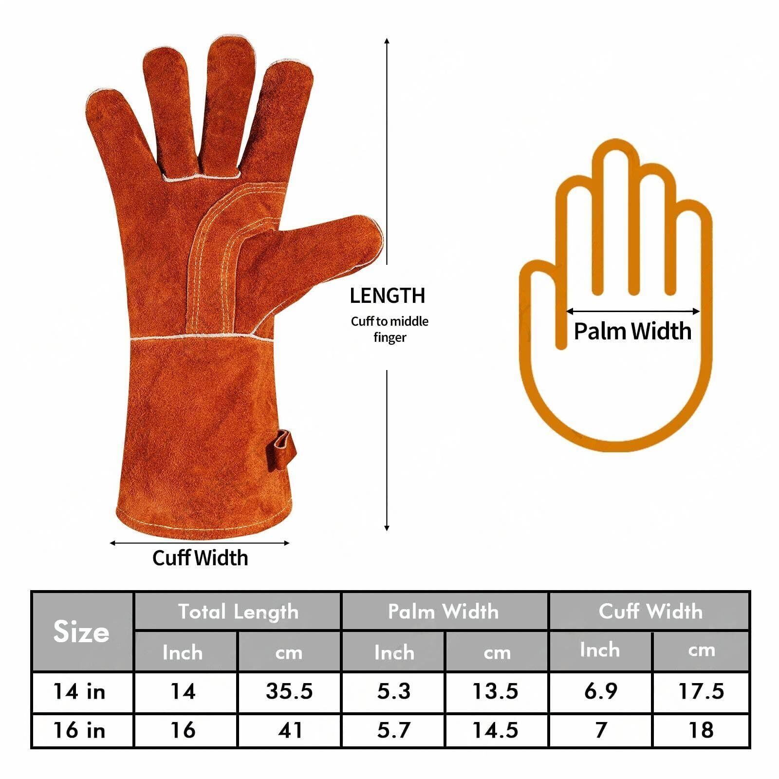 プレミアム耐火レザー&耐熱コットンライナー - 本物の牛革とスプライスレザーで作られたこれらの手袋は、100%耐熱コットンライナーと難燃性ステッチが特徴です。 14インチデザインは、溶接火花、粉砕破片、火、直火、熱い石炭に対して優れた前腕保護を提供し、ファイヤーピット、薪ストーブなどに最適です。
