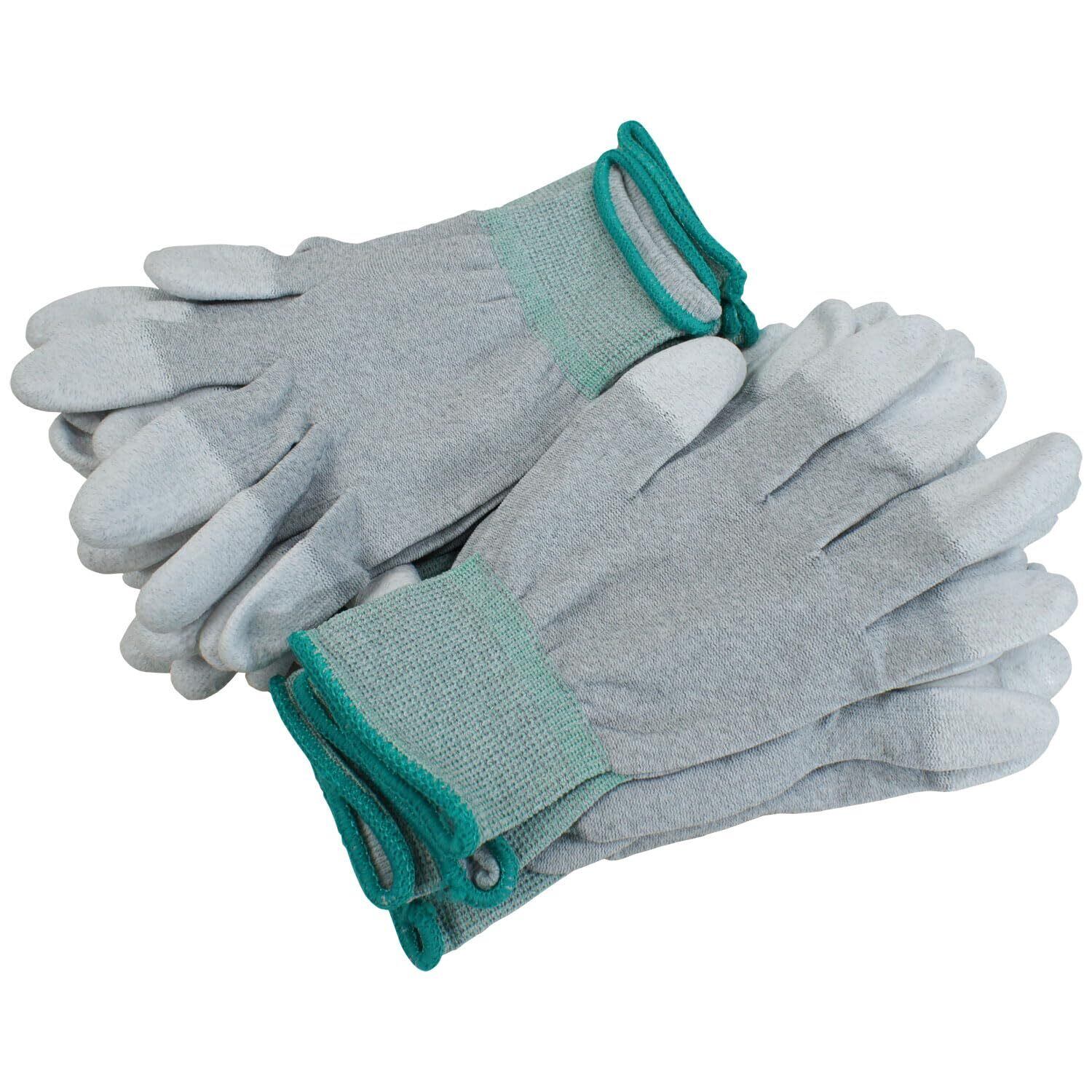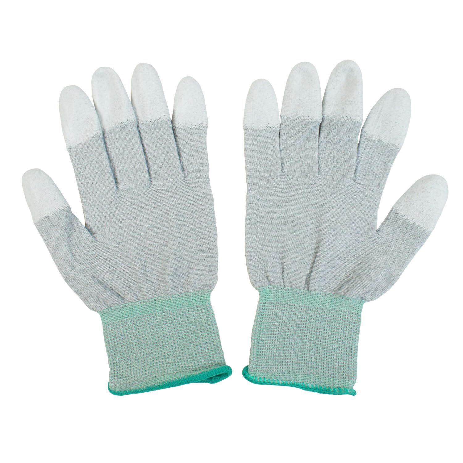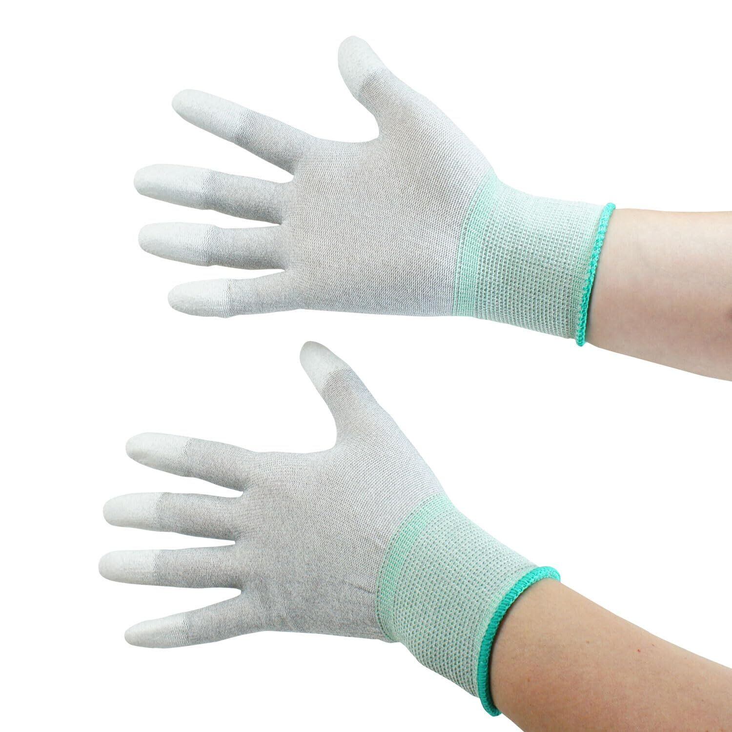カーボン糸が縫い込まれた13ゲージのナイロン手袋の指先にポリウレタンをコーティングしました。 静電気が起きにくく、組立・検査工程などの作業に適しています。