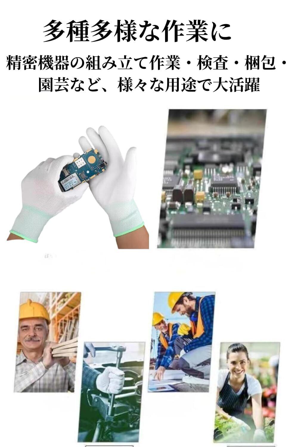 【様々な作業に】精密機器の組み立て作業、製品の検査作業、電子部品組み立て作業、ピッキング、梱包、園芸など、様々な用途で作業用手袋として大活躍。