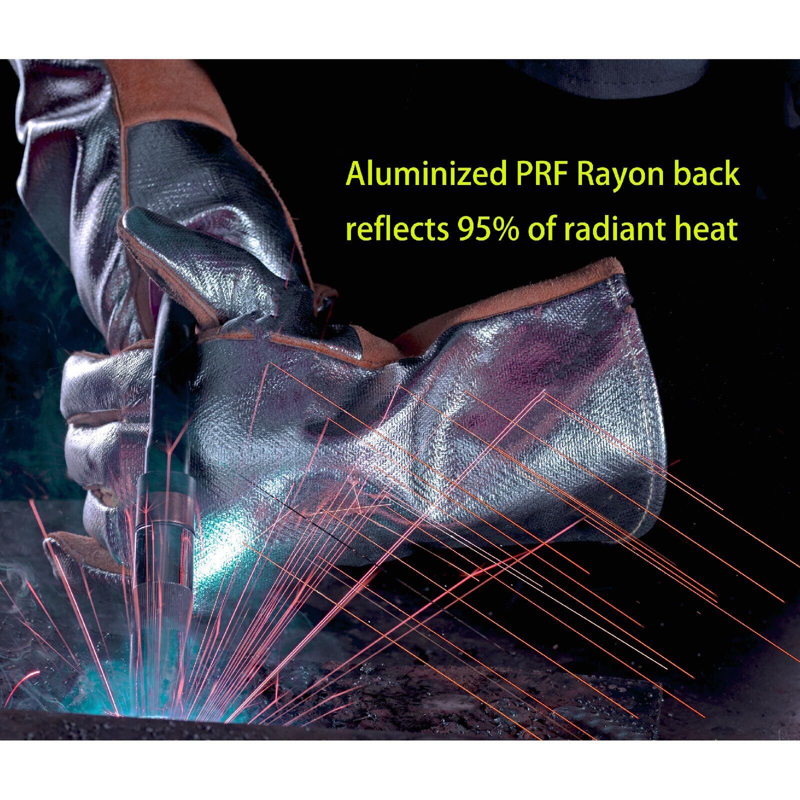 このアルミメッキバック「バックタン・ワイドボディ」 熱反射溶接手袋は、放射熱を95%反射します。 高電流フラックス入り、MIG、TIG、スティック、ガス切断などの高放射熱溶接プロセスに最適です。 溶接工のアーク時間を延長し、生産性を向上させることができます。