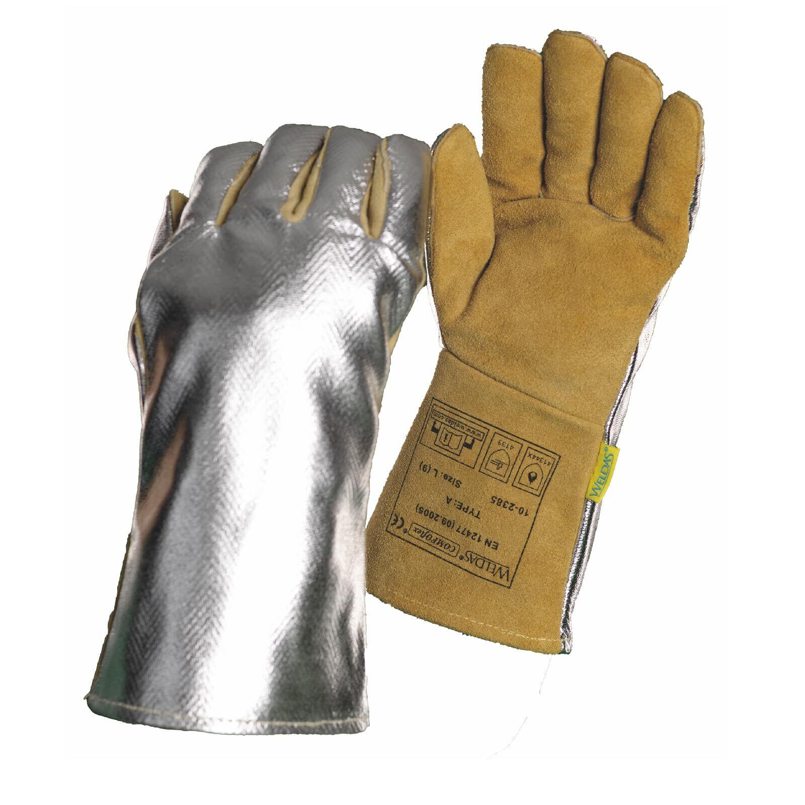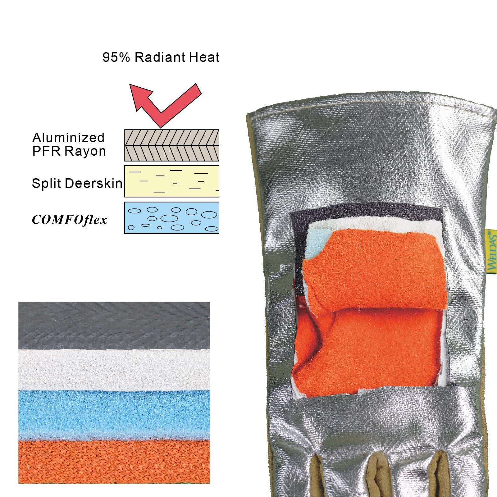 [COMFOFLEX] Weldas® 裏面アルミニウム処理 プレミアム熱反射溶接手袋、独自の難燃性エアクッション 裏地、10-2385、バックなめし (砂)。