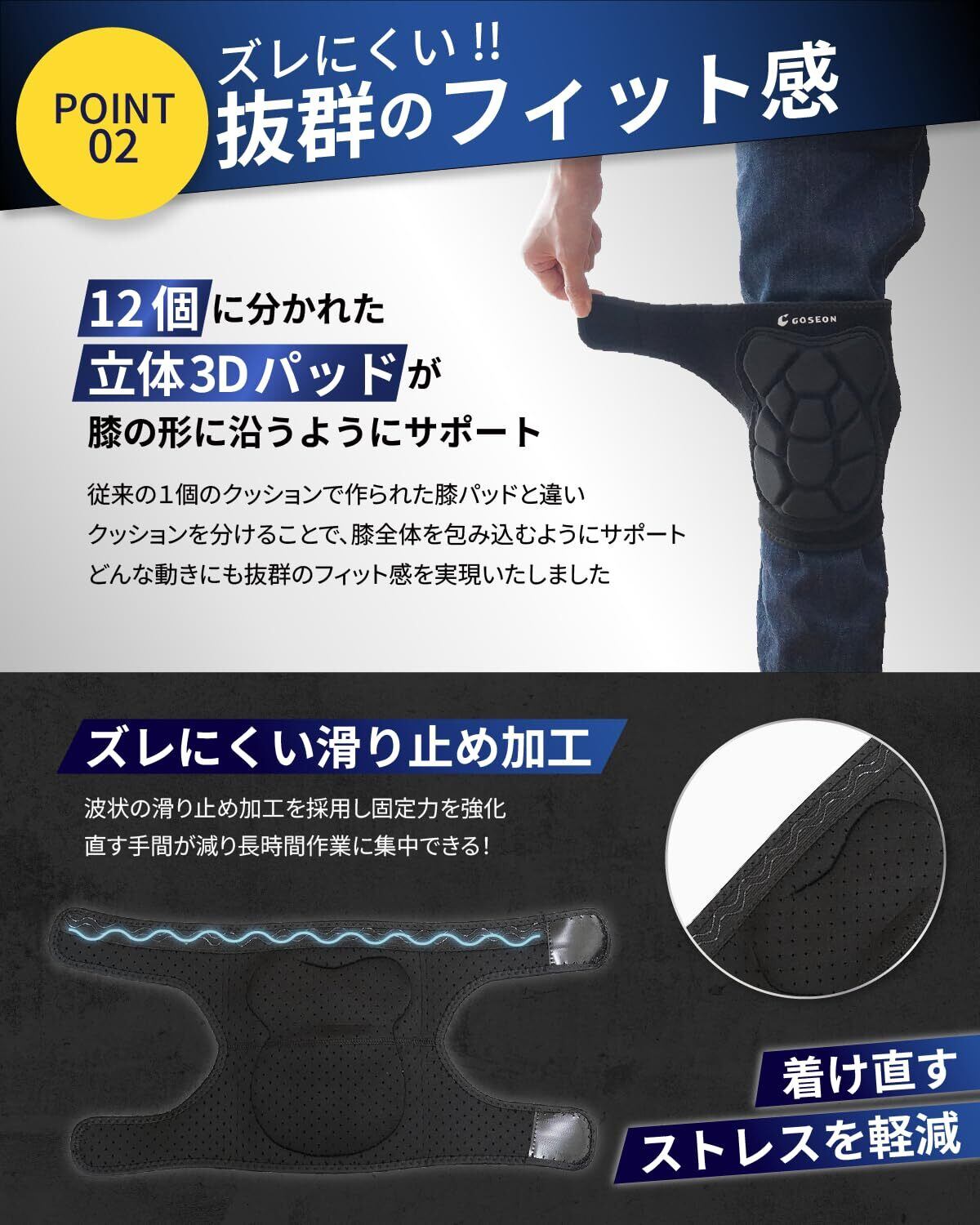 【新着商品】【理学療法士監修】膝当て 作業用 【肉厚15mmパッドが衝撃から膝を守る】 大きいサイズ ズレにくい 強力面ファスナー採用 滑り止め加工 膝パッド 膝サポーター 膝当てサポーター プレミアム 両膝セット ニーパット 保育 介護 掃除 屋内外使用可能 男女兼用 GOSEON