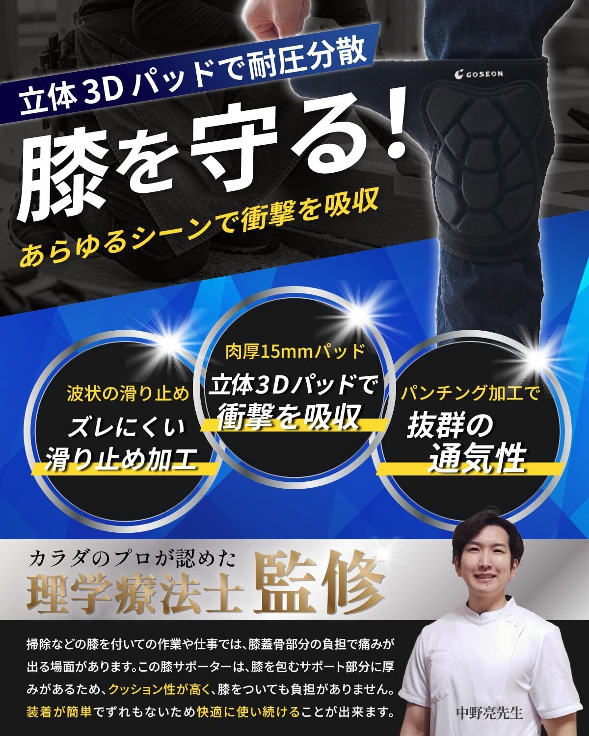 【理学療法士監修】膝当て 作業用 【肉厚15mmパッドが衝撃から膝を守る】 大きいサイズ ズレにくい 強力面ファスナー採用 滑り止め加工 膝パッド 膝サポーター 膝当てサポーター プレミアム 両膝セット ニーパット 保育 介護 掃除 屋内外使用可能 男女兼用 GOSEON