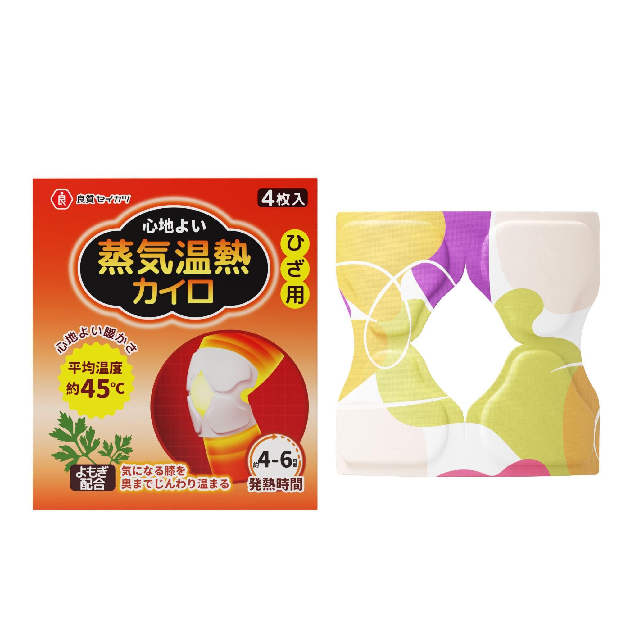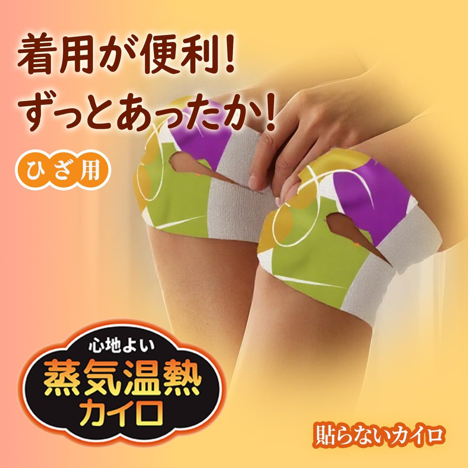 ひざ用 蒸気温熱カイロは、約45℃の心地よい暖かさで奥までじんわり温まる使い捨てカイロです、巻いて止めるだけ簡単、よもぎの力で冷えたカラダをやさしく温めてくれます。
