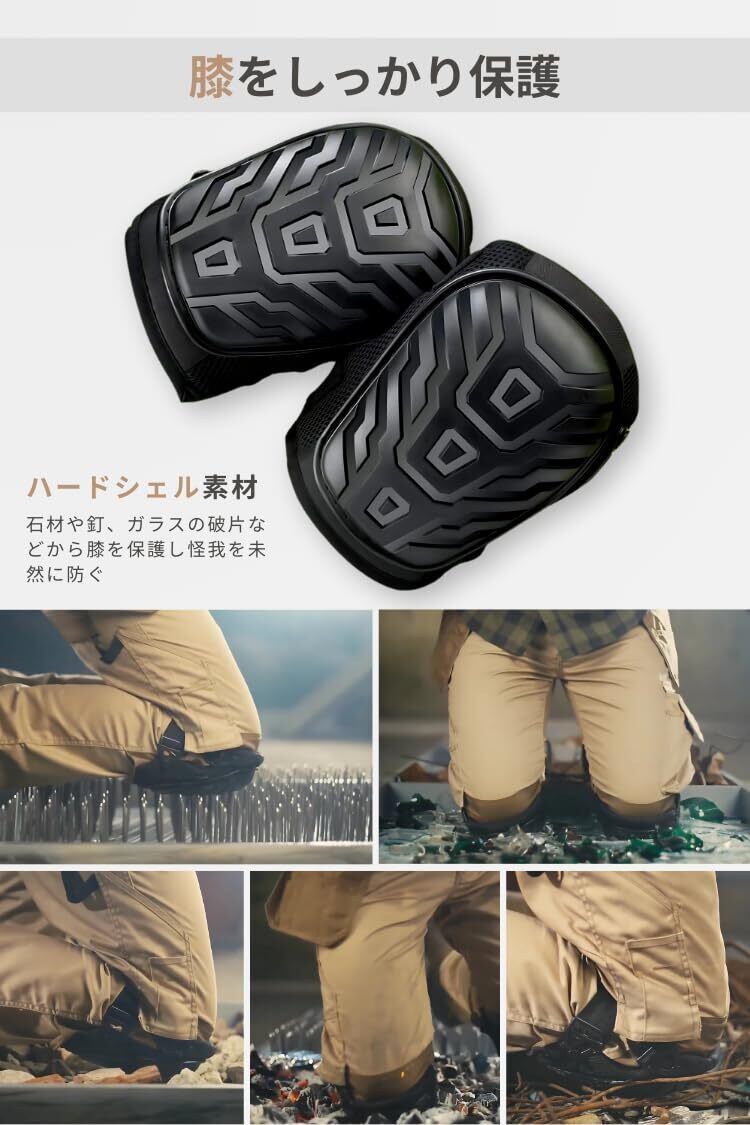 頑丈:建築現場に対応する高い耐久性。石材や釘、ガラスの破片などから膝を保護し怪我を未然に防ぎます。