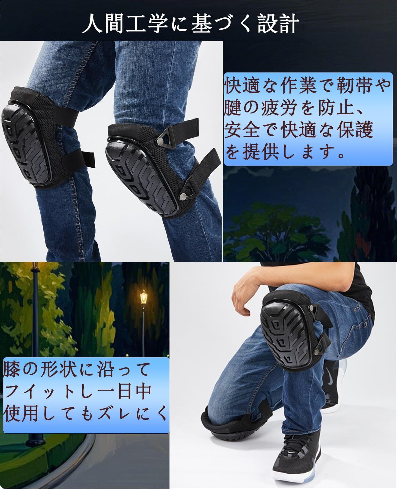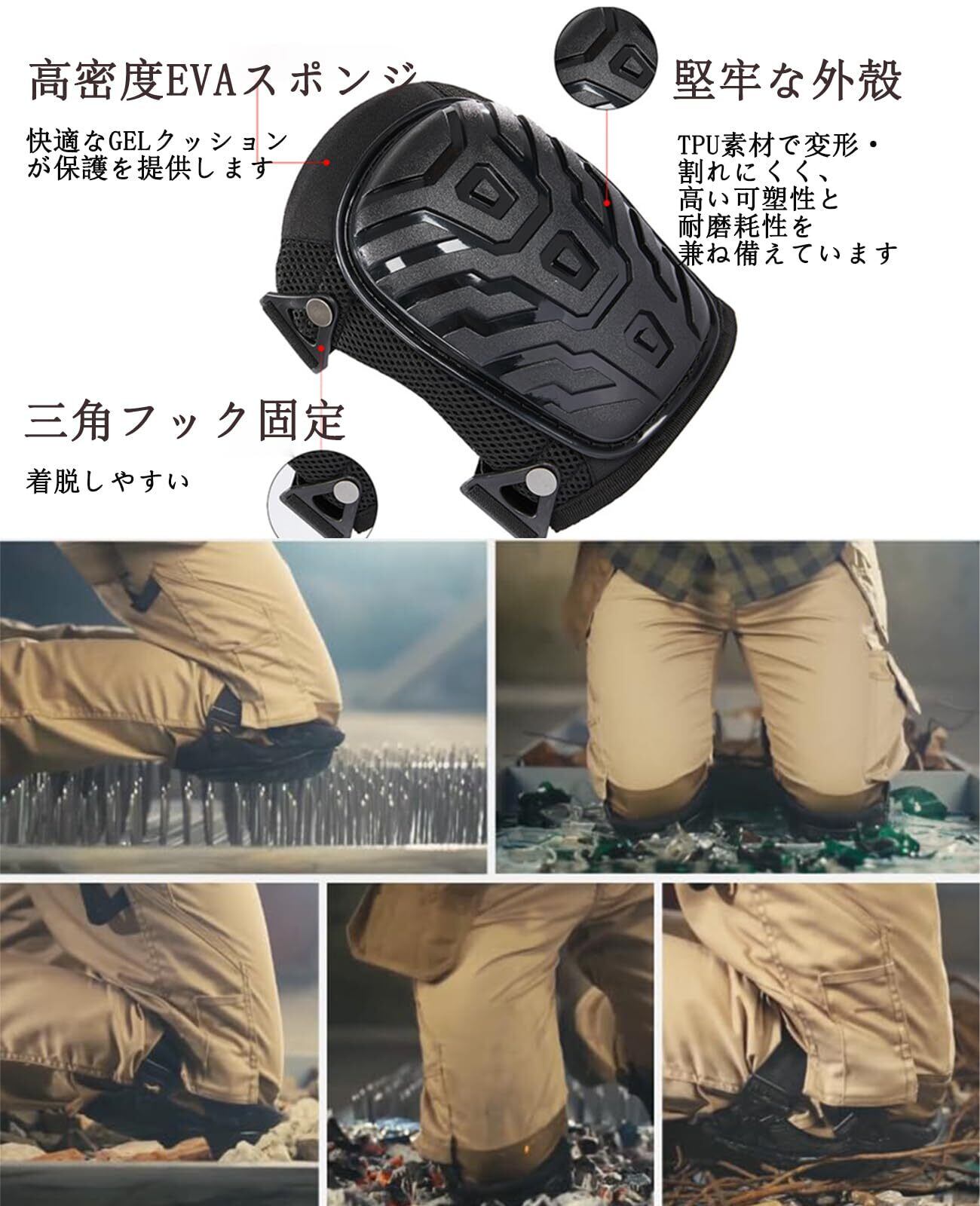 【高品質TPU、頑丈、衝撃吸収、】:この膝当てサポーターは、材質にスポーツシューズの靴裏などにも用いられる、弾力のある高品質TPUを使用しており、柔軟性と弾力性をあわせもった仕上がりになっています。厚手のパッドのため硬い地面に膝をついて作業がしやすい。高い耐久性で建築現場に対応します。石材や釘、ガラスの破片などから膝を保護し怪我を未然に防ぎます。