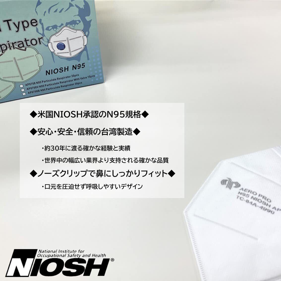 【在庫限り】台湾製 Aero Pro N95マスク 米国NIOSH承認 1箱30枚 折りたたみ式 頭かけタイプ