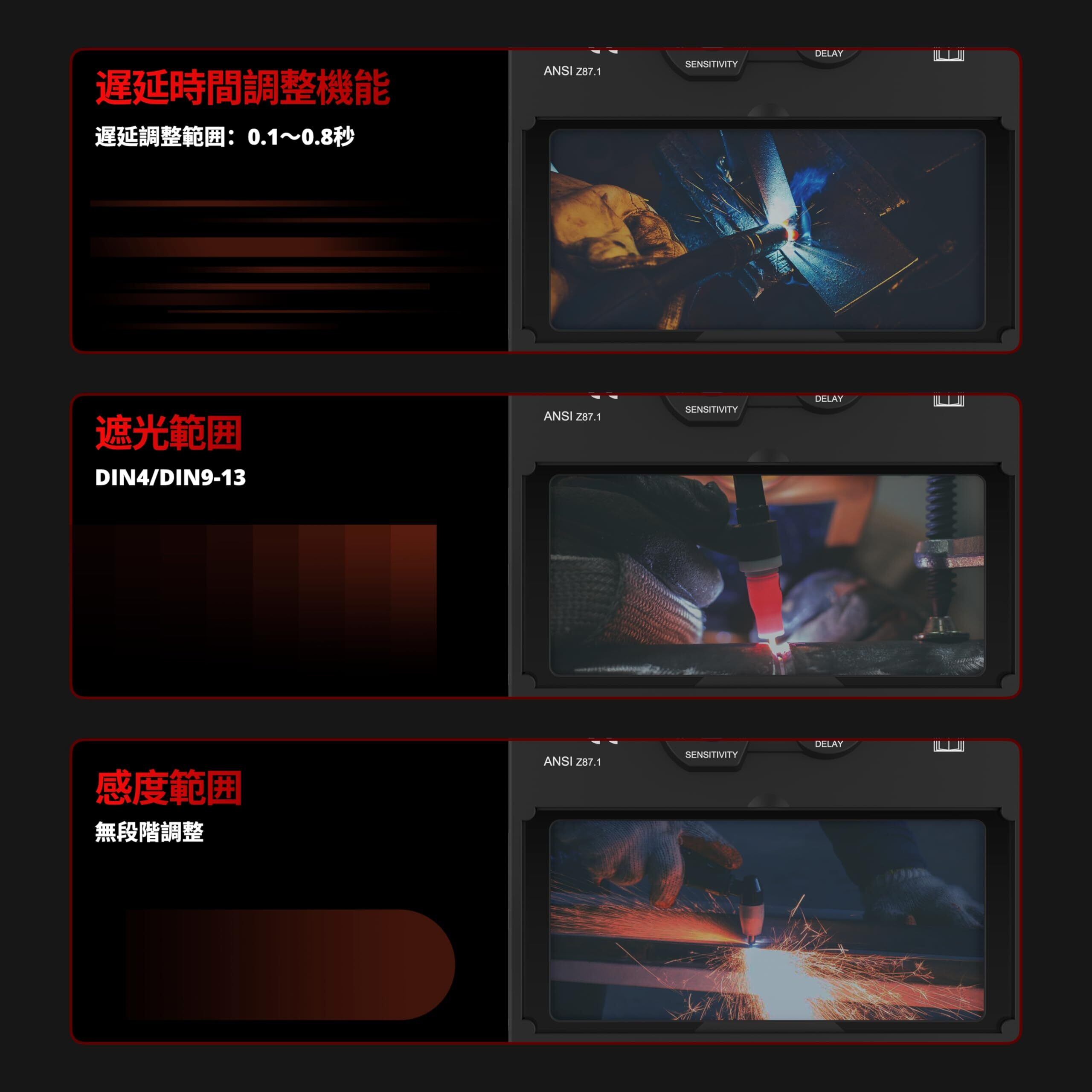 【調整しやすい】外付けの変光レベル調整ダイヤルを採用し、遮光範囲はDIN4/9~13。溶接 面を着脱せずに、素早く溶接モードを切り替え可能です。さらに、内蔵の無段階感度・遅延調整ダイヤルにより、溶接機作業後の研磨作業への切り替えなど、さまざまな作業シーンに簡単に対応できます。