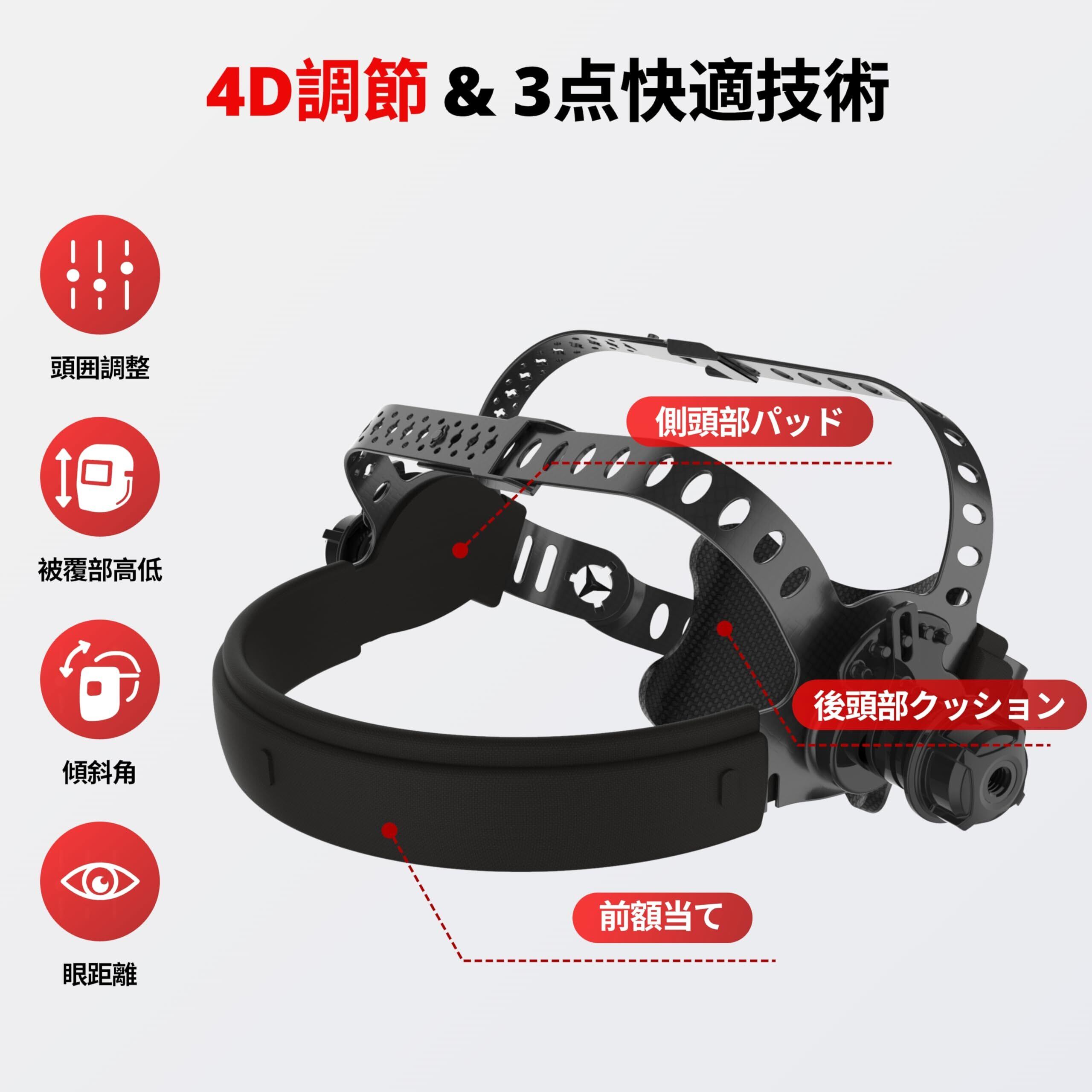 【一日中快適な装着感】この溶接用Welding Maskはわずか470gの軽量設計。3か所の快適緩和ゾーンを備え、吸汗性・通気性に優れ、頭部にフィットします。4-Way調整機能(頭囲・高さ・角度・目とレンズの距離)により、あらゆる頭の形に合わせられ、メガネをかけたままでも快適に使用可能。家庭用・修理作業・自動車板金・バイク整備・建築・DIY・製造業など、さまざまなシーンで活用できます。