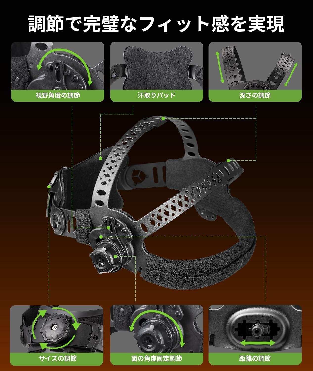 【軽量フィットで、長時間の負担を軽減】 軽量かつ高耐久性のPP素材を採用し、重量はわずか480gです。長時間の溶接作業でも首や肩への負担が大幅に軽減されます。視野角度やレンズと目の距離を細かく調整可能で、常に最適な視界を確保できます。さらに、ヘッドギア部分には着脱可能な吸汗クッションを装備、蒸れや圧迫感を抑え、快適装着を実現します。