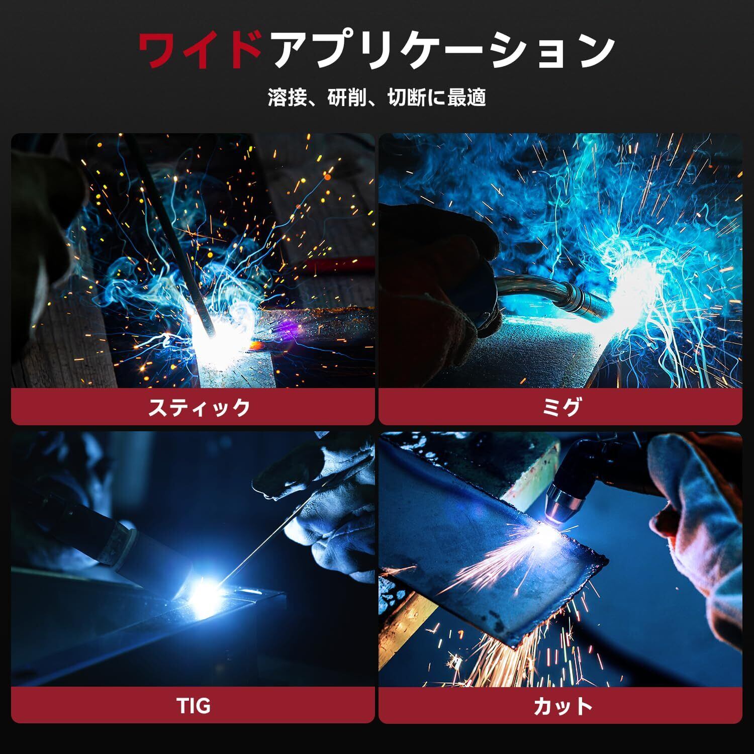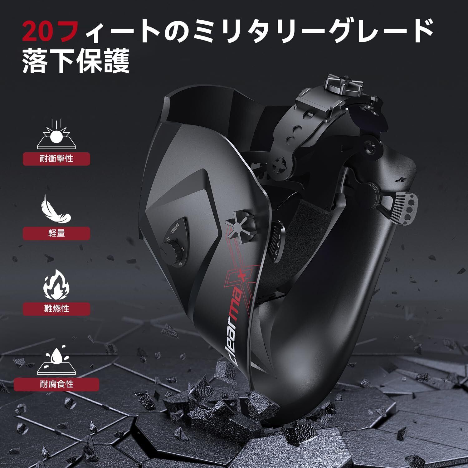 【高速自動調光機能】この溶接ヘルメットは、4つのプレミアムアークセンサーを搭載したハイエンド自動調光レンズを採用し、光から暗へ1/25000秒で切り替わります。レンズの濃さと感度を異なる作業環境に合わせて簡単に調整でき、TIG/MIG/ARC溶接に最適です。暗状態レベル:4/9-13。
