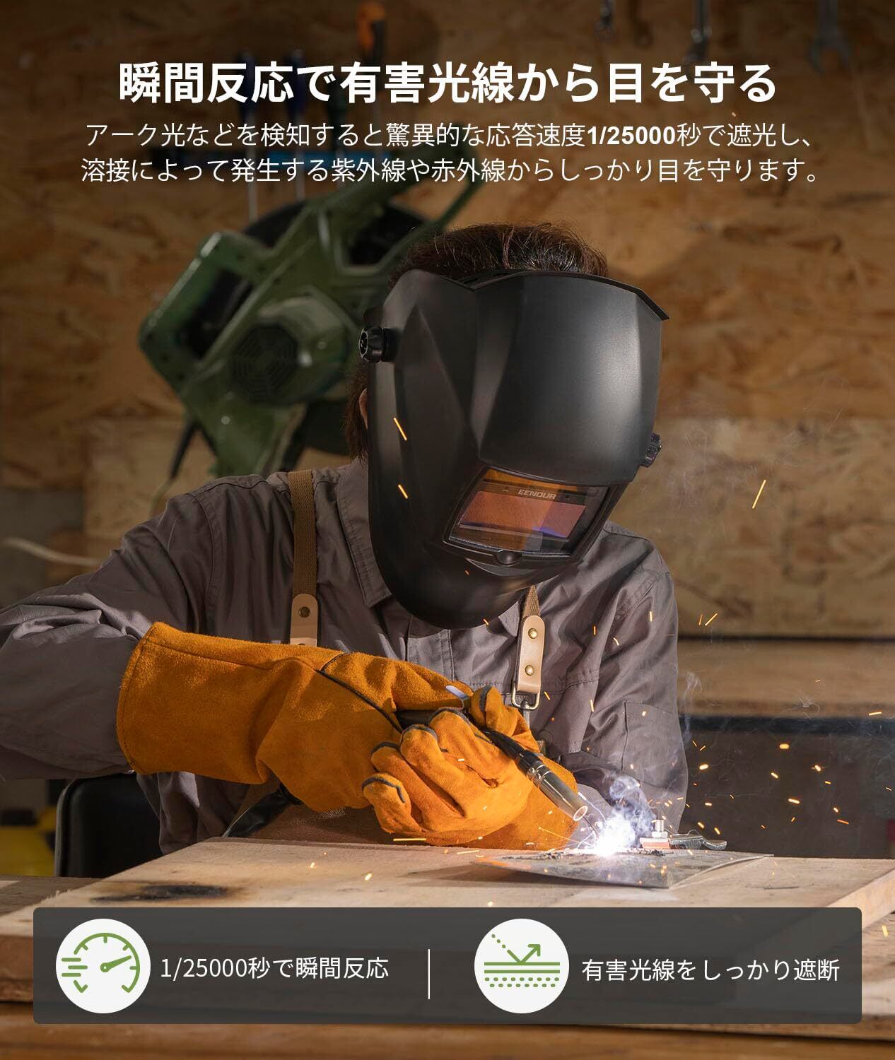 【瞬間反応でしっかりと目を守れる】アーク光などを検知すると、驚異的な応答速度1/25000秒で自動的に遮光します。溶接によって発生する眩しい光だけでなく、目に見えない赤外線や紫外線など有害な光線も効果的に遮断します。また、従来の手持ち型と異なり、両手を自由に使うことができ作業しやすいです。