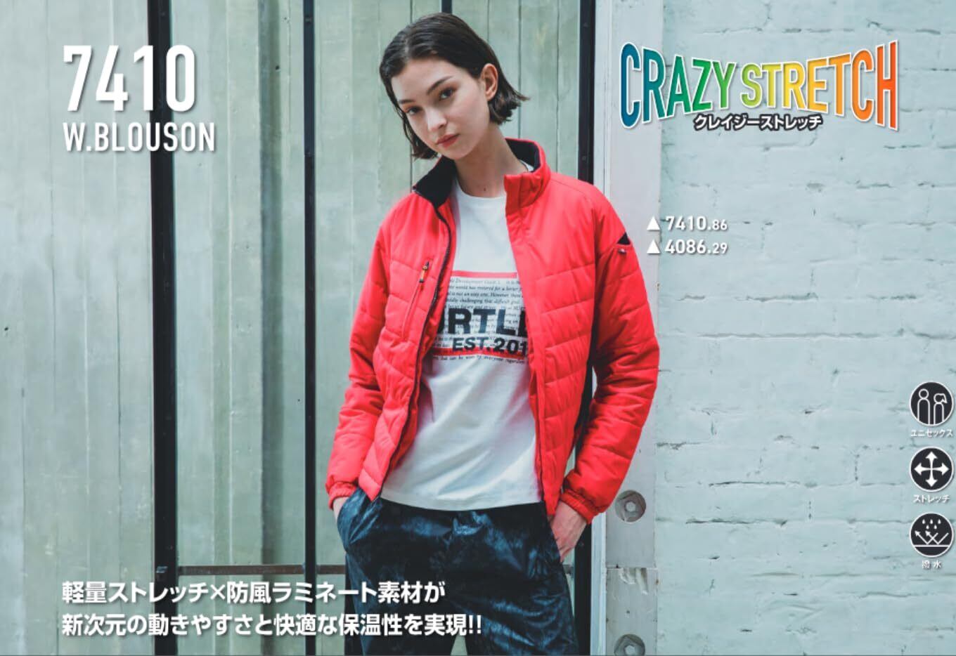 バートル7410は、軽量・防風・保温設計(PUラミネートコーティング)を施した軽防寒ブルゾンです。防風加工をしているので、冬場の外での作業において、冷たい風から身を守り快適に仕事を行うことが出来ます。寒さを防ぐための防風・保温機能を備えながら、軽量で動きを妨げないフリーストレッチ素材を用いることで、軽快に仕事をこなせると好評です。男女兼用で、やや細身のレイザーシルエットになっています。