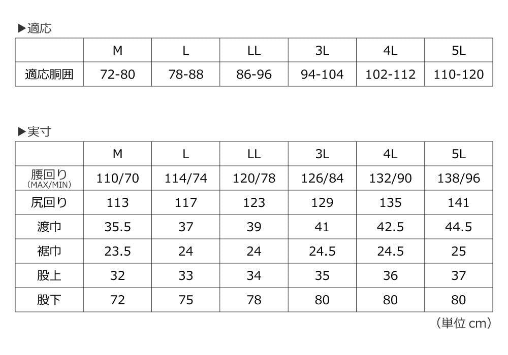 SIZE:M ウエスト:70~110㎝ 股下:72㎝ 渡幅:35.5㎝、SIZE:L ウエスト:74~114㎝ 股下:75㎝ 渡幅:37㎝、SIZE:LL ウエスト:78~120㎝ 股下:78㎝ 渡幅:39㎝、SIZE:3L ウエスト:84~126㎝ 股下:80㎝ 渡幅:41㎝、SIZE:3L ウエスト:84~126㎝ 股下:80㎝ 渡幅:41㎝、SIZE:4L ウエスト:90~132㎝ 股下:80㎝ 渡幅:42.5㎝、SIZE:5L ウエスト:96~138㎝ 股下:80㎝ 渡幅:44.5㎝